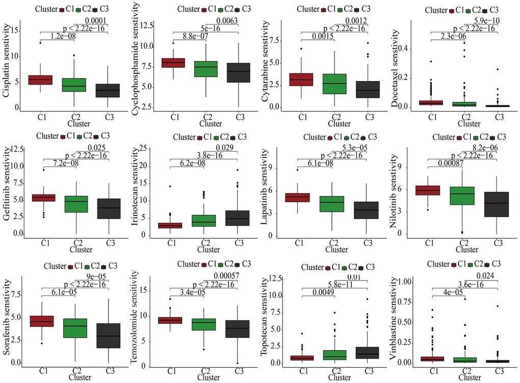 For further exploration about the discrepancies of the drug sensitivity in the three clusters, the Genomics of Drug Sensitivity in Cancer database (GDSC; https://www.cancerRxgene.org) was utilized to predict therapy response. The GDSC database linked drug sensitivity to genomic data then the IC50 of the samples were obtained. Of note, a lower IC50 suggests that the cancer cells are more sensitive to the compound.