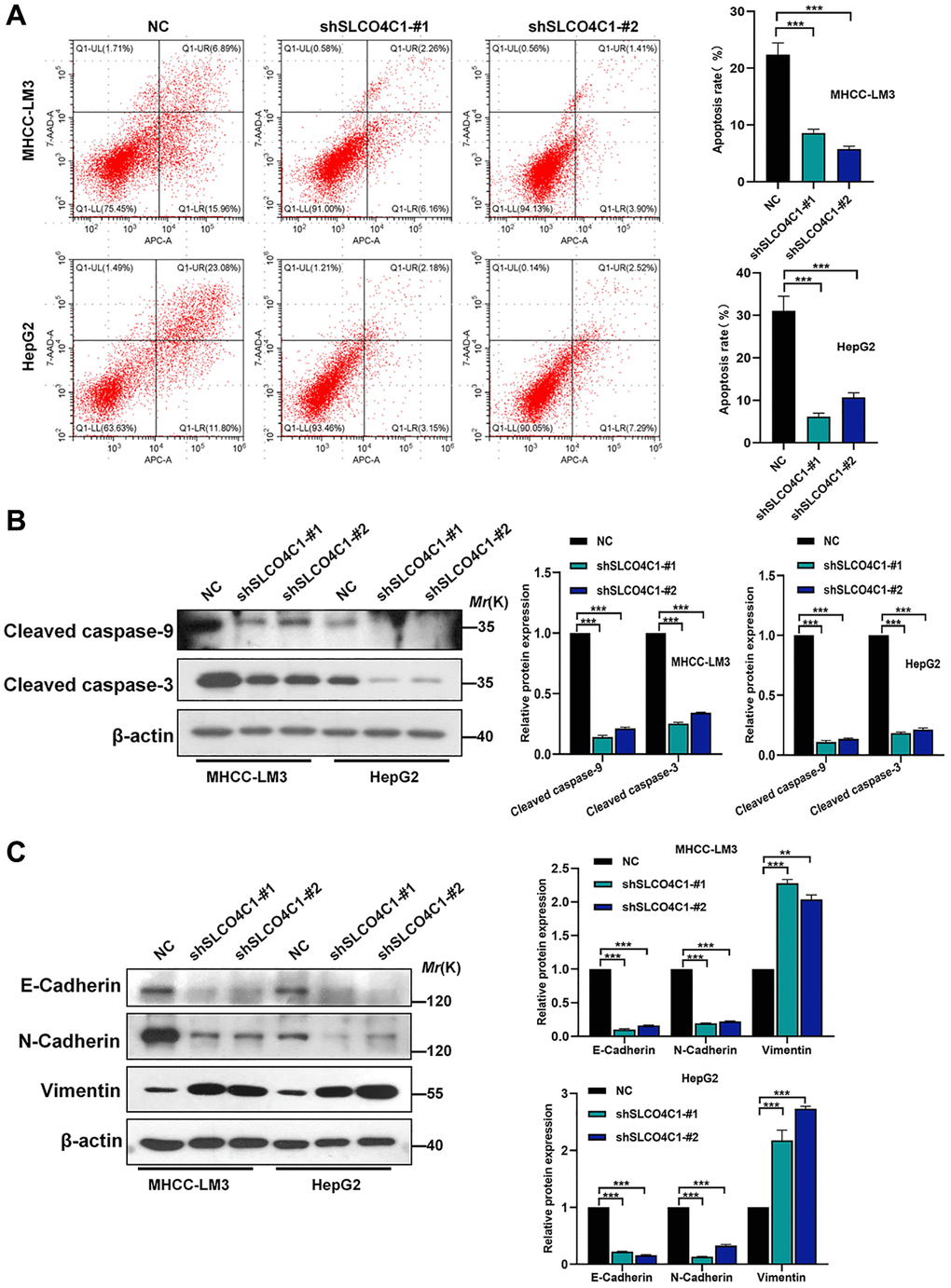 The rate of apoptosis detected in the SLCO4C1 knockdown group was reduced, indicating that SLCO4C1 knockdown inhibited the apoptosis of HCC cells (Figure 11A). In the SLCO4C1 knockdown group, decreased expression of the apoptosis-related protein caspase-3/9 was detected (Figure 11B). The metastatic progression of the tumor is tightly associated with EMT. We further found that E-cadherin and N-cadherin expression were significantly reduced, while vimentin expression was significantly upregulated in the SLCO4C1 knockdown group (Figure 11C). This suggests that reduced expression of SLCO4C1 can promote EMT progression in HCC cells.