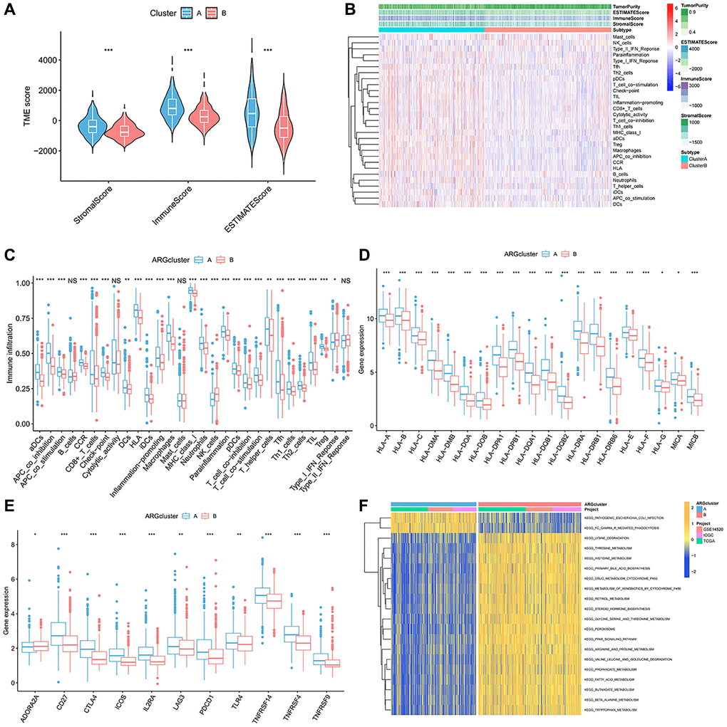 To explore the immune infiltration and TME distinction in the anoikis subtype population, we calculated the corresponding feature scores. In terms of scoring, the immune, stromal, and ESTIMATED scores were lower in subgroupB than in subgroupA (Figure 2A). SubgroupB also contained less immune cells than subgroupA (Figure 2B). Quantitative analysis of 29 immune cells showed high levels of APC costimulatory cells, CD8+ T cells, HLA, iDCs, macrophages, pDCs, T cells co-stimulation, Th cells, and Treg cells in the subgroupA population (Figure 2C). The expression of the HLA family in subgroupA also showed consistency (Figure 2D). We noted that both costimulatory and corepressed cells were highly enriched in the anoikis resistant subpopulation. Similarly, the corepressor was more enriched in subgroupA (Figure 2E). This suggests a combined role of immunosuppression and stimulation in the anoikis resistance subgroup. GSVA analysis found that subgroupA was associated with the phagocytosis pathway, while subgroupB was involved in multiple amino acid metabolism and biosynthesis (Figure 2F).