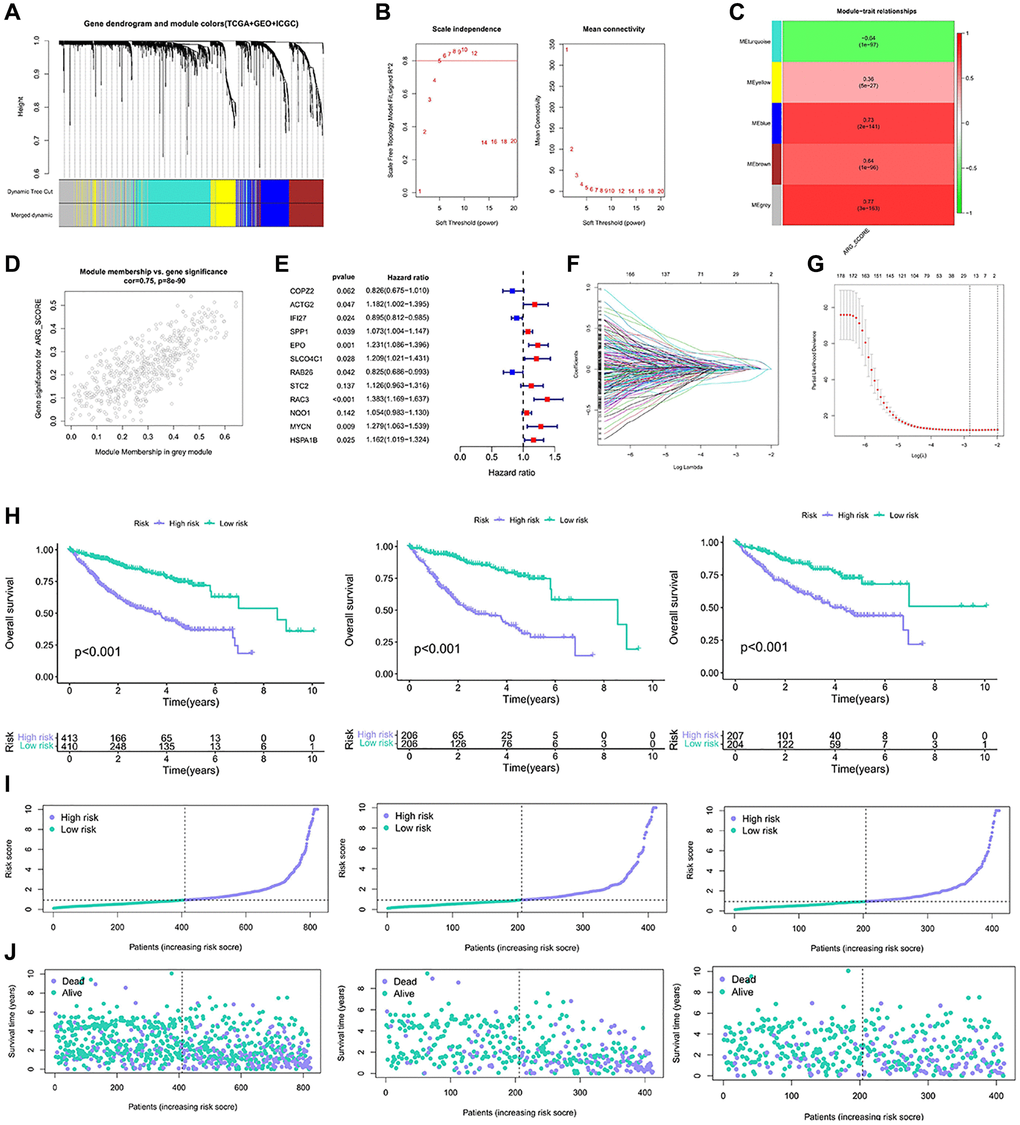 To identify differential genes associated with anoikis, we identified differential genes between the two genotypes. 6830 differentially expressed genes (EDGs) were identified. Then, these DEGs are classified as distinct modules passing through WGCNA (Figure 3A, 3B). The anoikis score was calculated using the ssGSEA. Among all the modules examined, the grey module showed a strong correlation with the anoikis score (R2 = 0.77, P = 33e−163) (Figure 3C, 3D). We developed a risk model based on anoikis clustering to predict prognosis. Firstly, 192 genes were obtained by univariate Cox analysis of 491 genes (Supplementary Table 1). After univariate analysis, the genes were analyzed by Lasso-Cox, and 12 gene expression characteristics based on aniokis were selected (Figure 3E, 3F). The 12 genes information were shown in Table 1. The survival curve demonstrated that the high-risk group exhibited a poorer overall survival (OS) (Figure 3G). The same results are also shown in the train group and the test group (Figure 3H). The elevated score corresponds to an increased proportion of high-risk patients and an increased risk of death (Figure 3I). The correlation was found between the risk survival status analysis and increased mortality, and the OS was relatively short (Figure 3J). The anoikis model showed a potential prognostic value.