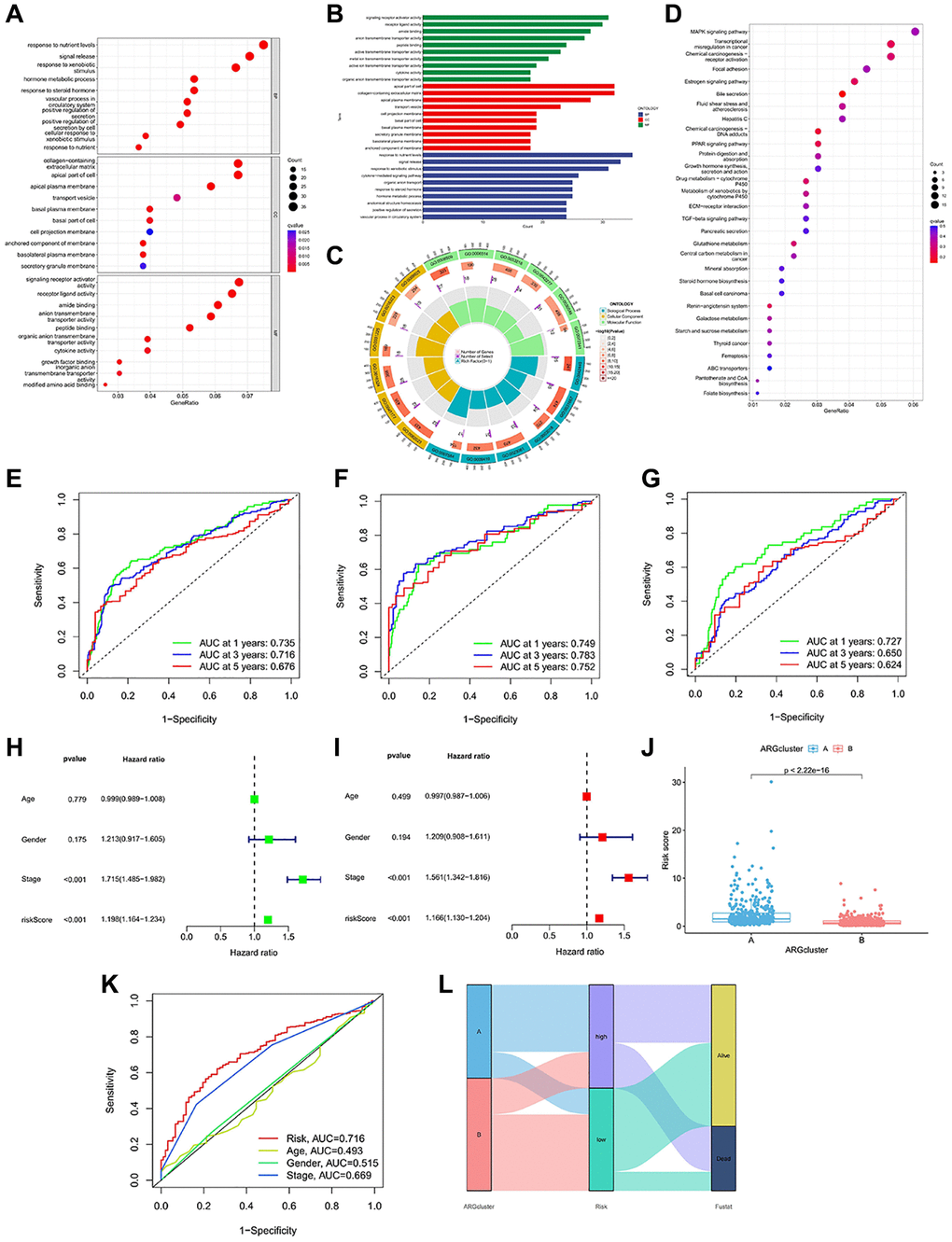 Moreover, the accuracy of the anoikis model was also validated. In the complete dataset of HCC, the AUC values for 1-, 3- and 5-year OS were 0.735, 0.716, and 0.676 (Figure 4E). In the training group, the AUC values for 1-, 3- and 5-year OS were consistent with the complete dataset, measuring at 0.749, 0.783, and 0.752 (Figure 4F). Similarly, the test set exhibited consistent results, with AUC values of 0.727, 0.650, and 0.624 for 1-year, 3-year, and 5-year OS (Figure 4G). The anoikis model we constructed has shown differences in survival, and further independent prognostic analysis was carried out. Stage and risk score have been identified as prognostic factors in this study (Figure 4H, 4I). When comparing the risk differences between the two anoikis types, we observed a significantly lower risk in clusterB compared to clusterA (Figure 4J). The predictive value of the risk score and stage was also reflected in the ROC curve (Figure 4K). The Sankey chart illustrates that the majority of patients in the survival status belong to the low-risk group, while they consisted mainly of clusterB patients (Figure 4L). The majority of deceased patients exhibited higher risk scores and were associated with clusterA.
