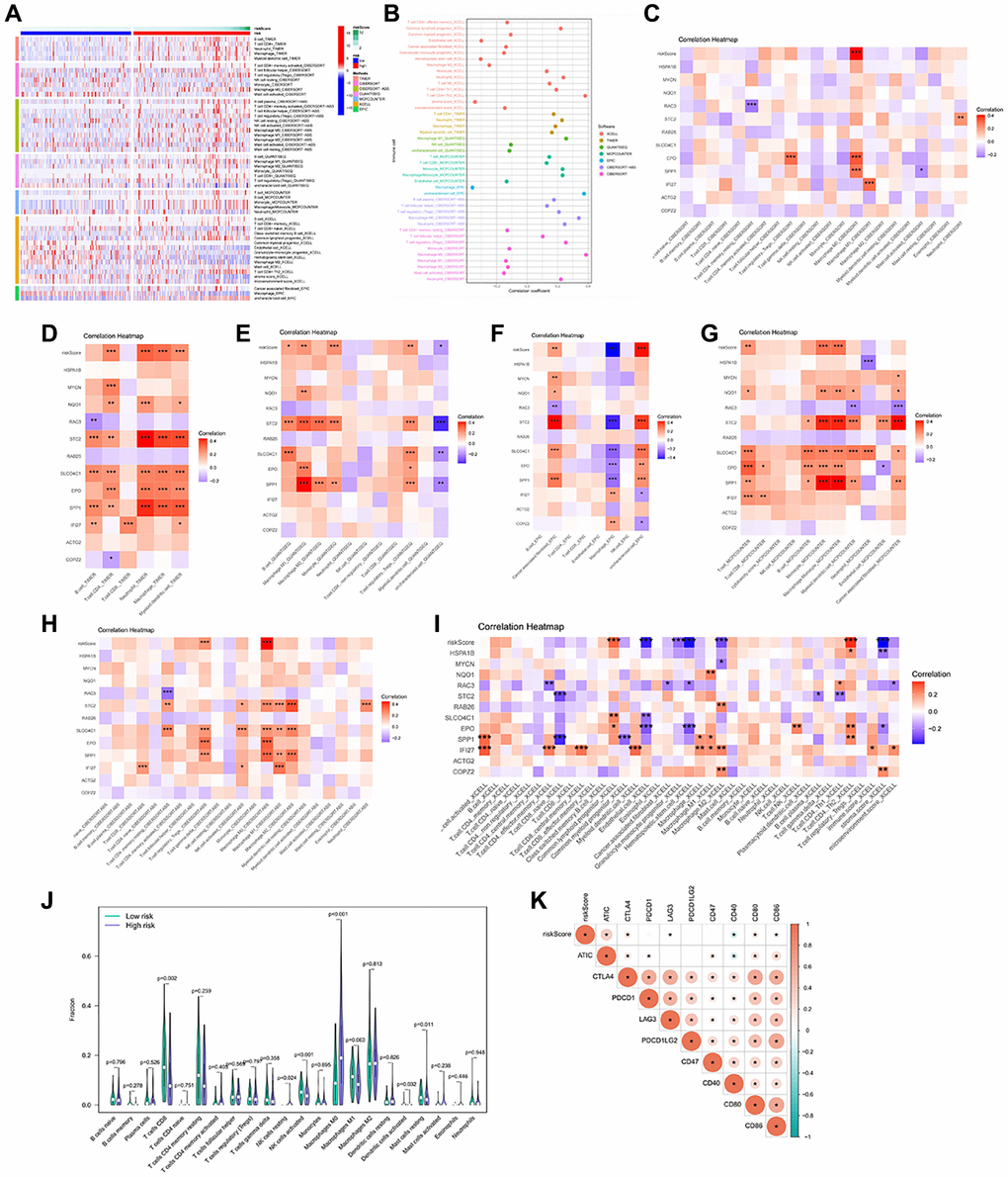 To better understand the potential mechanism of action of the anoikis, we investigated the correlation between anoikis and immune cell infiltration. The immune cell thermogram showed that the immune infiltration was more significant in the high-risk group (Figure 5A, 5B). We examined the correlation of signature genes and risk scores with immune cells, and most of the results were significant (Figure 5C–5I). The infiltration of CD8T cells, activated NK cells and resting mast cells was higher in the low risk group (Figure 5J). Immune checkpoint is an important target for immunotherapy. The analysis revealed a positive correlation between ATIC, CTLA4, LAG3, CD80, CD86, and the risk score (Figure 5K). These results suggest that the anoikis risk model is closely related to immune infiltration and may affect the responsiveness of immunotherapy.