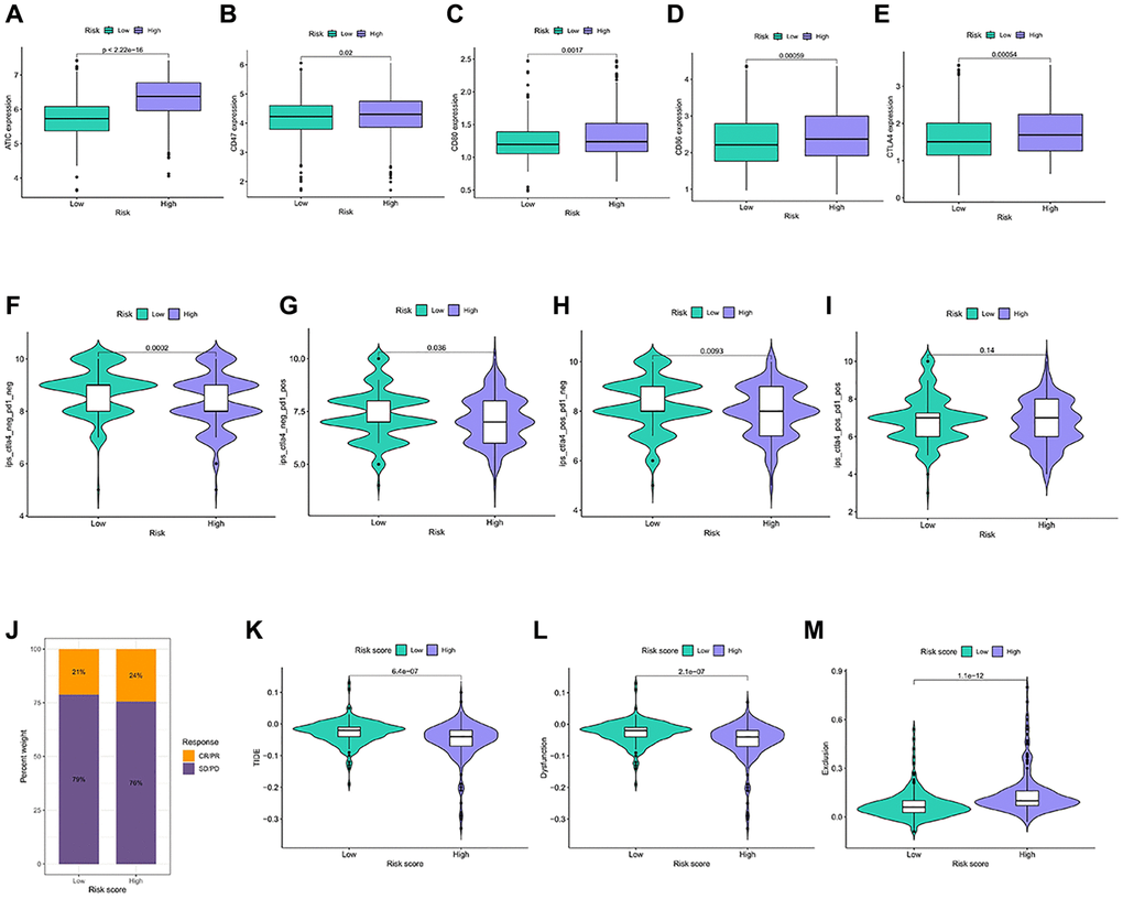 Immune checkpoints are universally selected targets for the development of immunotherapeutic agents, and understanding the expression of their related genes helps in predicting the efficacy of immunotherapy. ATIC, CD47, CD80, CD86, and CTLA 4 were more abundant in the high-risk group (Figure 6A–6E). Patients in the higher-risk group achieved a lower IPS score (Figure 6F–6I). In the independent immunotherapy outcome IMvigor210 cohort, the proportion of patients achieving CR/PR was relatively high in the high-risk group (Figure 6J). The TIDE score reflects the clinical response power of immunotherapy, and obtains higher TIDE and Dysfunction score and lower Exclusion score, which may indicate a poor treatment effect. The presence of relatively low TIDE and Dysfunction scores was observed in the high-risk group, compared with higher Exclusion scores (Figure 6K–6M). Patients in the high-risk group can get a better treatment effect.