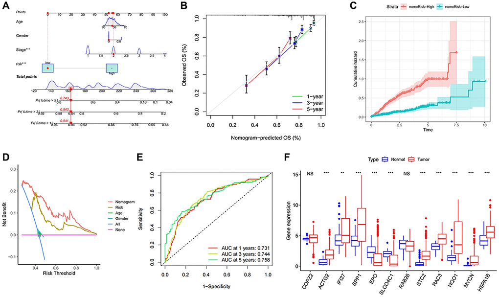 To exploit the potential of anoikis features in prediction, we developed a risk model. The anoikis prognosis model refers to the prediction of the probability and risk of patient mortality by evaluating the patient’s clinical data, biological features, and pathological features. The anoikis model was constructed based on the genes obtained from the Cox analysis. The model formula is: Risk Score = β1 × X1 + β2 × X2 + … + βn × Xn. In this formula, Risk Score represents the risk score, β1, β2, …, βn represent the feature weights (gene correlation coefficients), and X1, X2, …, Xn represent the feature variables (gene expression levels), which represent the value of each feature. The nomogram chart is a graphical tool for calculating risk scores. It intuitively displays the relationship between specific patient variables and risk outcomes through images. We constructed a nomogram that can be used for the prognostic evaluation of various clinical indicators. The calibration curve was employed to assess the concordance between the predicted and observed outcomes of the nomogram.