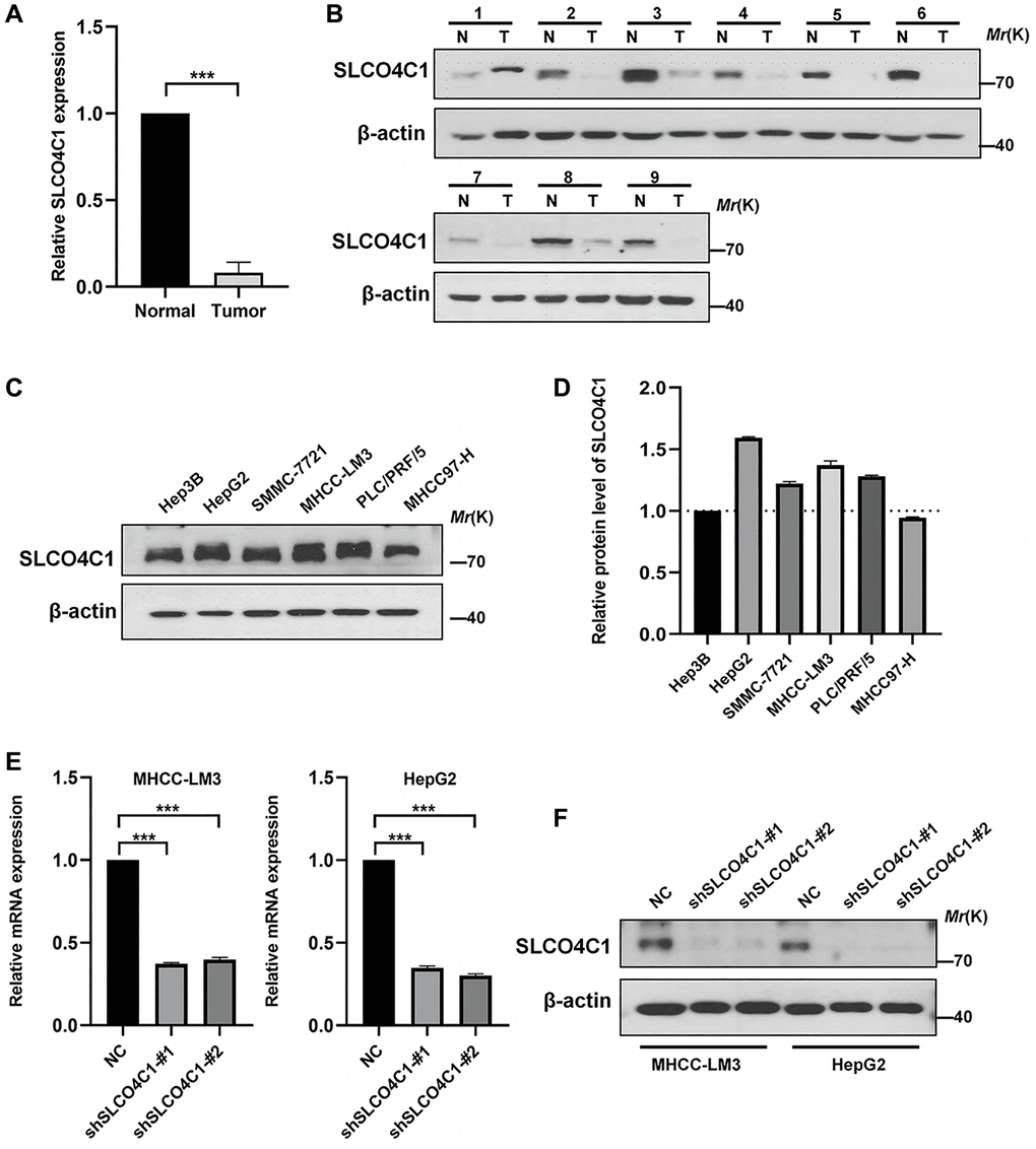 The expression of SLCO4C1 in HCC and normal tissues was assessed using RT-qPCR and Western Blotting. Low mRNA levels of SLCO4C1 in HCC tissues (Figure 9A). The SLCO4C1 protein expression was also downregulated in HCC tissues (Figure 9B). SLCO4C1 expression levels were found to be higher in HepG2 and MHCC-LM3 among the six different HCC cell lines (Figure 9C, 9D). HepG2 and MHCC-LM3 cell lines were selected to transfect SLCO4C1 knockdown specific shRNA for further study. The figure shows that sh1 and sh2 have better inhibitory effect on SLCO4C1 protein expression than NC group in two selected HCC cell lines. The inhibitory effects of sh1 and sh2 on SLCO4C1mRNA level and protein expression level were significant in these two cell lines (Figure 9E, 9F).