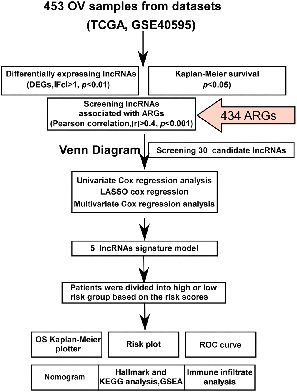 In conclusion, the study conducted a comprehensive analysis of prognostic arlncRNAs in ovarian cancer. It identified a 5 arlncRNA signature that accurately predicted the prognosis of ovarian cancer patients. The signature model demonstrated its potential as an independent prognostic factor and outperformed age and stage in predicting survival. The study also provided insights into the biological functions and pathways associated with the signature, highlighting immune-related pathways and oxidative phosphorylation. Moreover, the 5 arlncRNAs were found to regulate immune infiltration and oxidative stress in ovarian cancer. The expression of these arlncRNAs were validated in ovarian cell lines and the biological function of siPRR34_AS1 or siSPAG5_AS1 were validated to promote apoptosis and anoikis in ovarian cancer cell lines.
