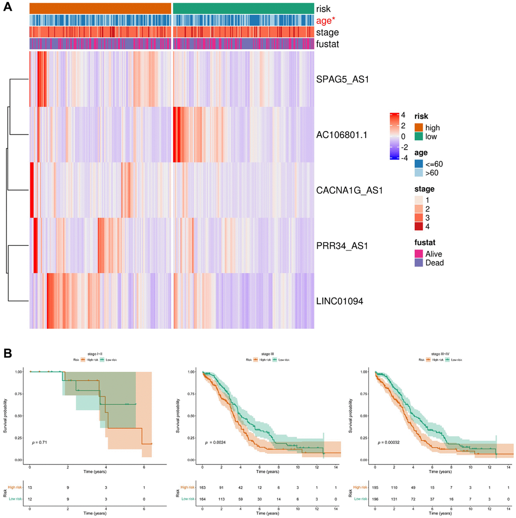 Among the five lncRNAs, four were considered risk lncRNAs, and they were upregulated in the high-risk group in the ovarian cancer database, except for AC106801.1, which was a protective marker (Figure 5A). To explore independent factors in the signature model, we compared different clinicopathological parameters between the high-risk and low-risk groups. The heatmap displayed the correlation of age, stage, and fustat in the high-risk and low-risk groups (Figure 5A). Interestingly, we found a significant difference in age between the high-risk and low-risk groups (p < 0.05). Kaplan-Meier survival analysis showed that ovarian cancer patients in the low-risk group had a higher survival rate than those in the high-risk group at stage III and stage III-IV (Figure 5B), while there was no significant difference observed in early-stage ovarian cancer patients. Due to the non-specific symptoms contributing to over 75% of ovarian cancer diagnoses at an advanced stage [21], the clinical study’s inclusion of early-stage ovarian cancer patients is restricted. The limited sample size in the early-stage group may hinder the adequate detection of survival rate differences between low-risk and high-risk stages I-II, necessitating further examination. Therefore, these results indicated that the five arlncRNAs had an excellent ability to predict prognosis in ovarian cancer patients, especially at late stages (III/IV).