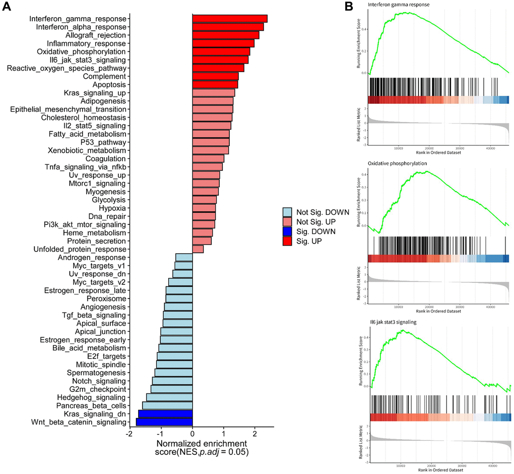 To further explore the underlying biological functions and mechanisms associated with the risk groups defined by the 5 arlncRNAs signature, we performed KEGG and GSEA enrichment analyses. The enrichment plot visualized the results of Hallmark and KEGG pathway enrichment analyses (Figure 6A and Supplementary Figure 2A), revealing that oxidative phosphorylation (OXPHOS) and immune-related pathways were significantly enriched in the high-risk group. GSEA analysis further demonstrated enrichment of the interferon gamma response (IFN-γ), OXPHOS, IL-6/JAK/STAT3 signaling pathway, chemical carcinogenesis-reactive oxygen species (ROS), chemokine signaling pathway, and cytokine-cytokine receptor interaction in the high-risk group, indicating their involvement in promoting ovarian cancer (Figure 6B and Supplementary Figure 2B). In summary, these results suggested that the risk score of the 5 arlncRNAs signature predominantly predicts prognostic survival through immune-related pathways and OXPHOS in ovarian cancer.