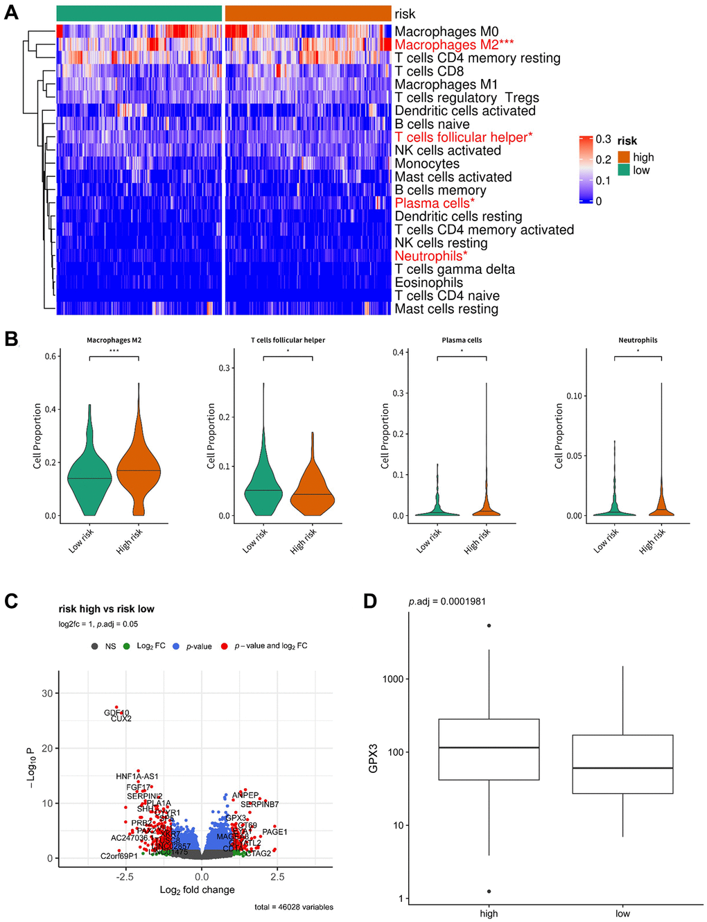 To investigate the relationship between the 5 arlncRNAs signature and the immune system, we compared the proportions of 22 different immune cells in the high-risk and low-risk groups using the CIBERSORTX algorithm, and a heatmap was generated (Figure 7A). The distribution of macrophages M2, T cells follicular helper, plasma cells, and neutrophils significantly differed between the two risk groups. Box plots showed that the proportion of T cells follicular helper was higher in the low-risk group, while the proportion of macrophages M2, plasma cells, and neutrophils was higher in the high-risk group (Figure 7B). To identify potential targets in ovarian cancer, we analyzed differentially expressed genes between the high-risk and low-risk groups (p < 0.05, |log2Foldchange| > 1) and visualized them with a volcano plot (Figure 7C). A box plot showed that the expression of glutathione peroxidase 3 (GPX3) was significantly higher in the high-risk group (Figure 7D). GPX3 is an extracellular antioxidant enzyme and the main ROS scavenger in plasma [22]. It is highly expressed in ovarian cancer and associated with platinum resistance and survival in ascites by protecting cancer cells from extracellular oxidative stressors [23]. Thus, the 5 arlncRNA signature regulates immune infiltration and oxidative stress in ovarian cancer.