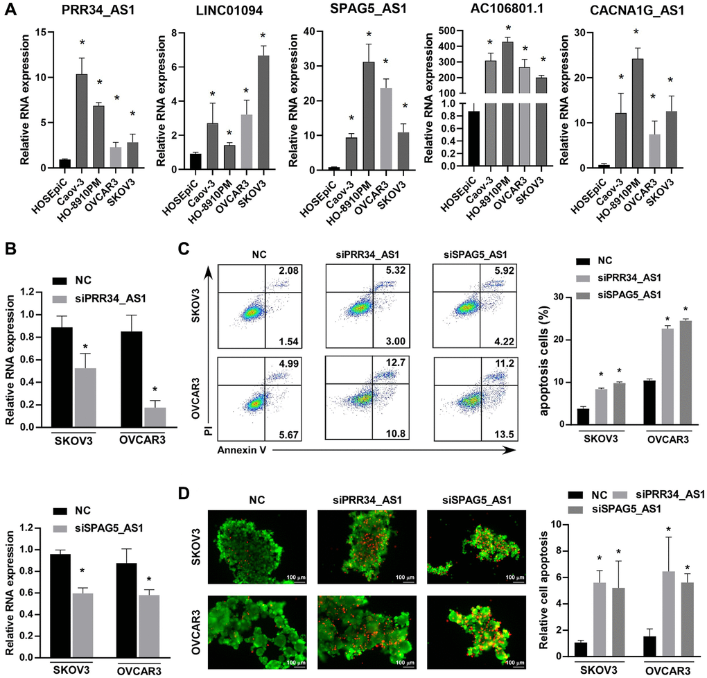 Additionally, we examined the expression of the five identified lncRNAs in various ovarian cancer cell lines, demonstrating their upregulation in ovarian cancer cells. We also conducted a series of apoptosis-related experiments, validating that the inhibition of PRR34_AS1 or SPAG5_AS1 can promote apoptosis and anoikis in ovarian cancer cell lines. However, our study has several limitations that need to be addressed. First, we lacked validation using clinical samples in our study. Second, the specific mechanisms by which these lncRNAs affect anoikis, inhibit immune infiltration, and promote ovarian cancer progression remain unknown. Further research is warranted to address these limitations and gain a better understanding of the underlying mechanisms.