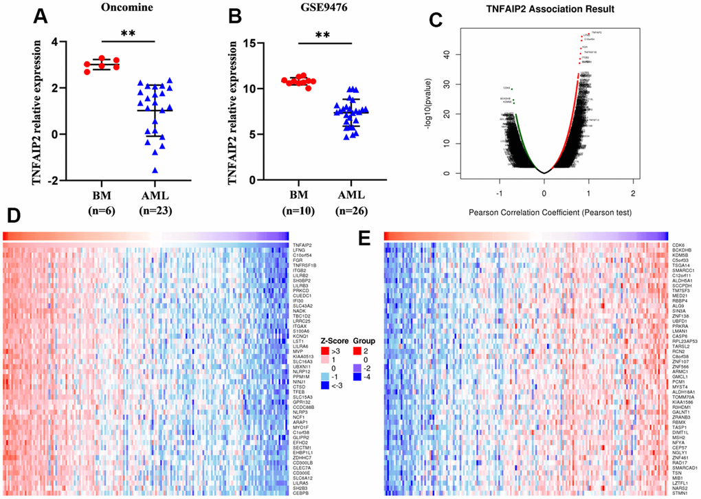 The GSE9476 dataset was downloaded from the GEO database and included gene sequencing information from 26 AML patients and 10 healthy individuals. Differences in TNFAIP2 mRNA expression between AML and normal tissues were analysed using GraphPad Prism 8.0.2.