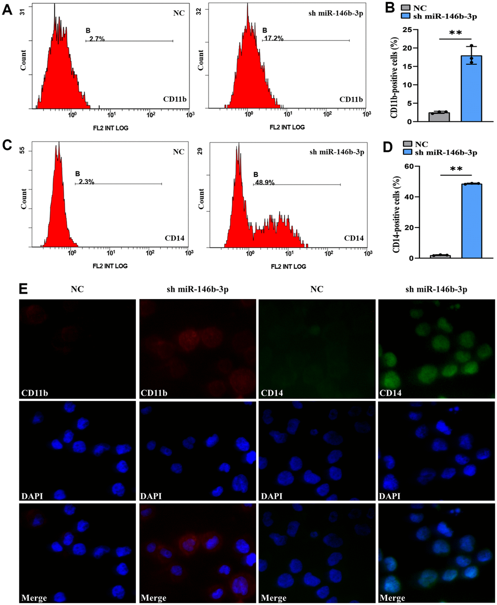 To elucidate the association as miR-146b-3p expression and cell differentiation, we transduced MOLM-13 cells with short hairpin miR-146b-3p (sh miR-146b-3p) and observed the CD11b+ and CD14+ cell frequencies. qRT-PCR assay demonstrated that expressed miR-146b-3p was markedly downregulated in a sh miR-146b-3p arm versus a negative control arm (P < 0.05, Supplementary Figure 2), suggesting that sh miR-146b-3p was successfully transduced into MOLM-13 cells. Flow cytometry results revealed that the CD11b+ and CD14+ cell frequencies were markedly increased in MOLM-13 cells transduced with sh miR-146b-3p versus a negative control arm (P < 0.05, Figure 10A–10D). Moreover, the immunofluorescence intensities of CD11b and CD14 in a sh miR-146b-3p group were higher than those in a negative control arm (Figure 10E). Therefore, these findings showed that suppression of miR-146b-3p expression can induce MOLM-13 cell differentiation. The above findings showed that overexpression of TNFAIP2 can induce the differentiation of MOLM-13 cells and that miR-146b-3p directly targets TNFAIP2. Considering the above results collectively, we proved that suppression of miR-146b-3p expression can attenuate the suppression of TNFAIP2 expression, thereby inducing the differentiation of MOLM-13 cells. This finding might be explained by the conclusion that cell differentiation is indeed related to the miR-146b-3p/TNFAIP2 axis.