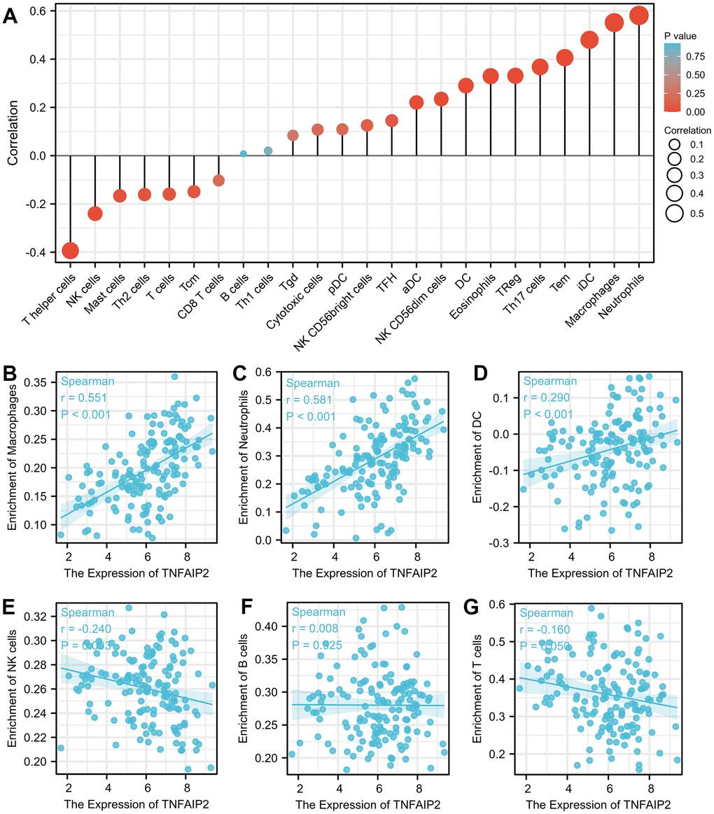 High expression of TNFAIP2 was markedly positively associated with the infiltration degree of macrophages (r = 0.551, P < 0.001), neutrophils (r = 0.581, P < 0.001), and dendritic cells (r = 0.290, P < 0.001). Moreover, the infiltration degree of natural killer cells and T cells in the TNFAIP2 high expression group were significantly lower than those in the TNFAIP2 low expression group (all P < 0.05) (Figures 4A–4G). TNFAIP2 may involve in the tumour immunomodulation, thus playing a role in inducing cell differentiation and other biological functions.