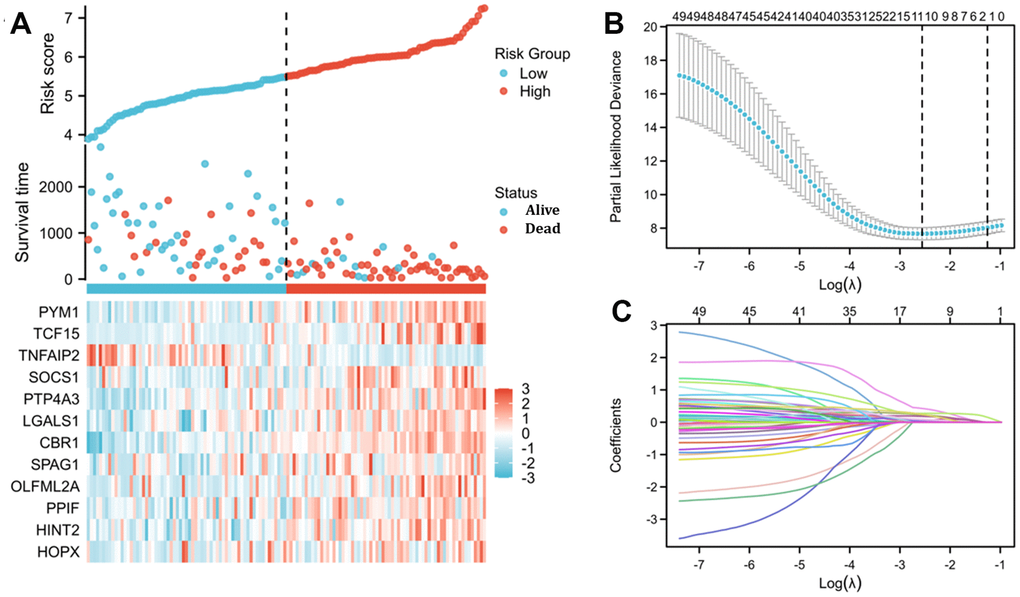 In total, 12 genes, including TNFAIP2, were identified to be correlated with the prognosis of 150 AML cases (the patients’ features are listed in Supplementary Table 2). On the basis of 12 prognostic genes, risk scores were calculated and categorised into different risk arms depending on the median scoring. The risk score was distributed among the 150 patients as shown in Figure 5A. Moreover, survival time distributions suggested the possibility that there was a positive correlation between higher risk scores and worse outcome. Subsequently, the least absolute shrinkage and selection operator (LASSO) regression algorithm was used to refine the gene sets by calculating regression coefficients (Figure 5B, 5C).