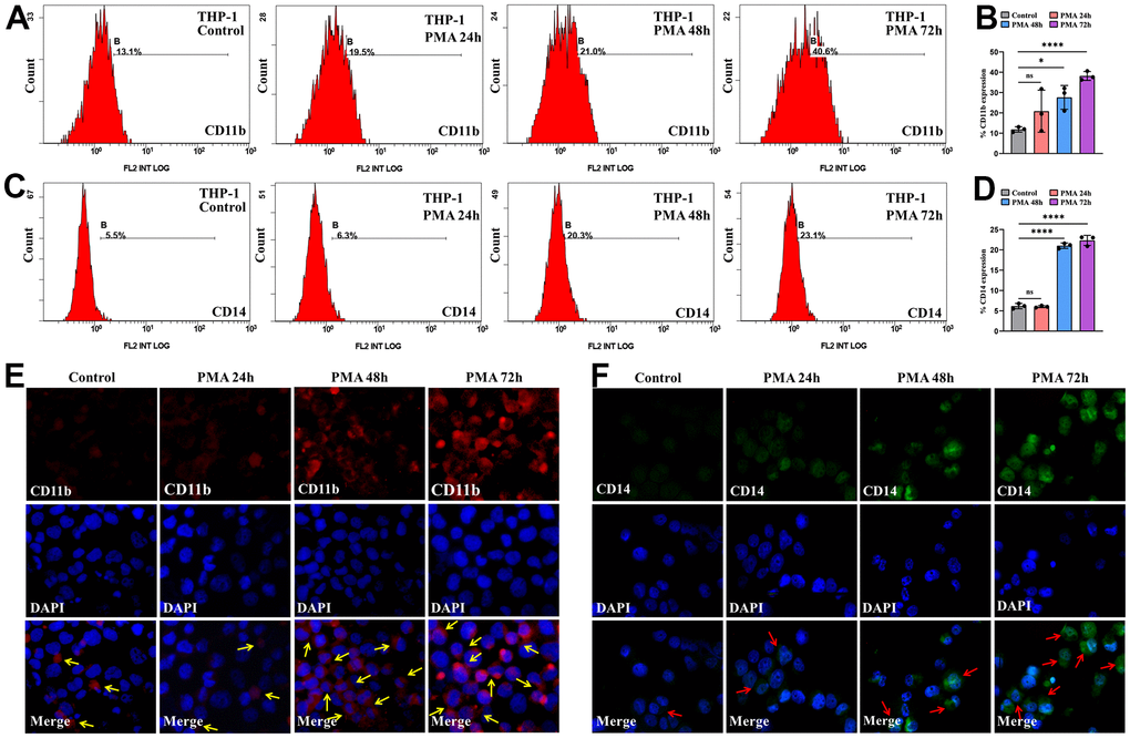 Cell differentiation was assessed using immunofluorescence staining with a PE-conjugated mouse anti-human CD11b antibody and an FITC-conjugated mouse anti-human CD14 antibody (BD Bioscience, USA). The proportion of cells positive for the cell surface differentiation antigen CD11b or CD14 was evaluated using flow cytometry. Each sample was randomly analysed, and 1×10^4 events were recorded. The cell differentiation rate was determined by DIVA software.