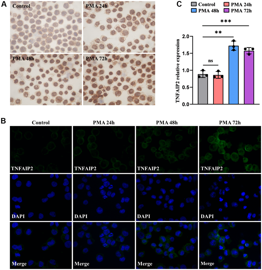 After PMA treatment, the CD11b+ and CD14+ THP-1 cell frequencies were significantly increased, and the expression levels of TNFAIP2 mRNA and protein were increased upon AML cell differentiation, demonstrating that TNFAIP2 might be related to cell differentiation in AML. Moreover, forced expression of TNFAIP2 increased the frequencies of CD11b+ and CD14+ MOLM-13 cells. Our results indicated that TNFAIP2 might directly induce AML cell differentiation, constituting one of the mechanisms by which PMA induces the differentiation of AML cells.