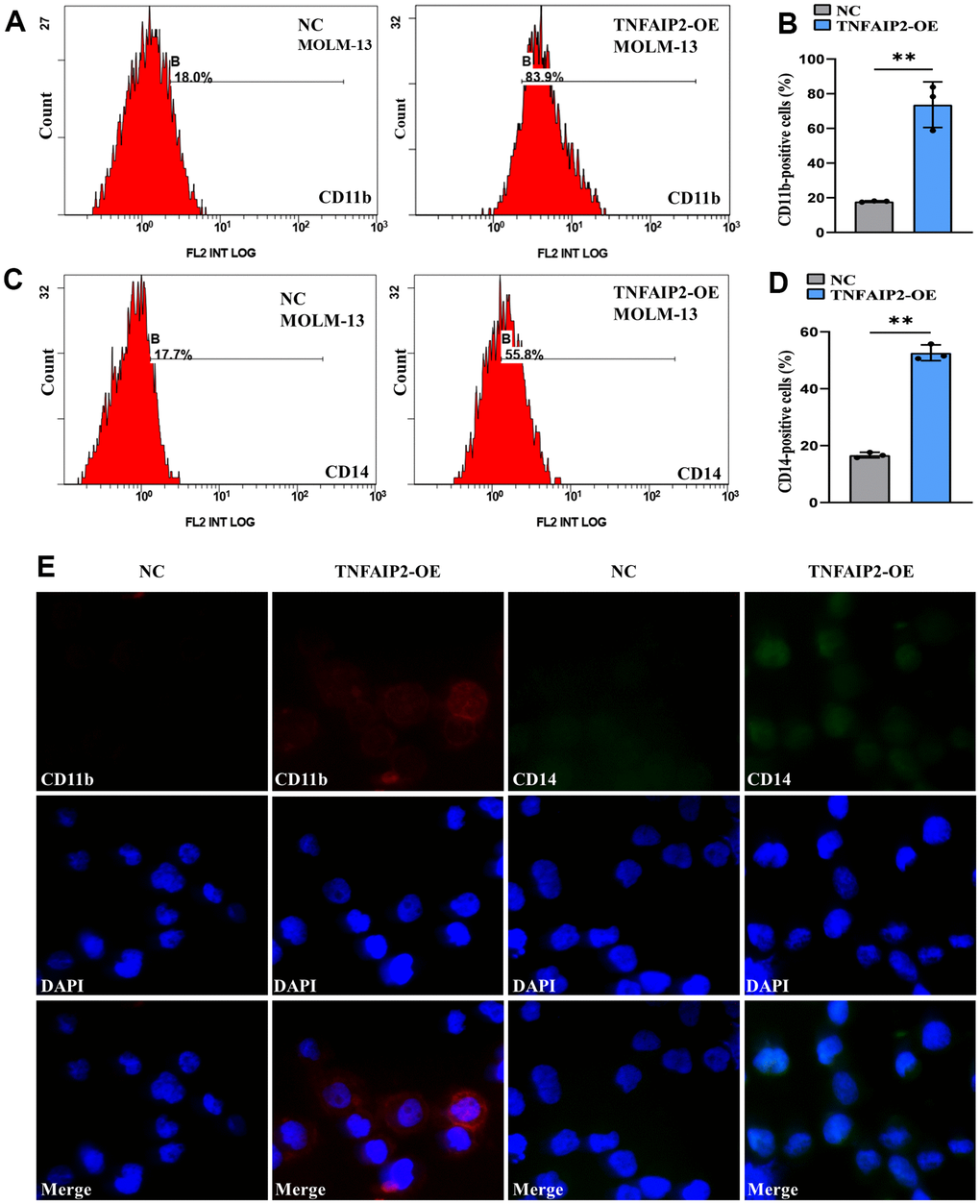To prove whether TNFAIP2 can induce the differentiation of monocytic leukaemia cells, we transduced MOLM-13 cells with the TNFAIP2 overexpression (TNFAIP2-OE) construct and observed the expression of CD11b and CD14. qRT-PCR assay demonstrated that expressed TNFAIP2 mRNA was markedly upregulated in a TNFAIP2-OE arm versus a negative control arm (P < 0.05, Supplementary Figure 1), which indicated that TNFAIP2-OE successfully transfected MOLM-13 cells. Flow cytometry results revealed that the CD11b+ and CD14+ cell frequencies were significantly increased in MOLM-13 cells transduced with the TNFAIP2-OE construct versus a negative control arm (P < 0.05, Figure 8A–8D). In addition, the immunofluorescence intensities of CD11b and CD14 in a TNFAIP2-OE arm were higher than those in a negative control arm (Figure 8E). These results indicated that TNFAIP2 can induce AML cell differentiation.