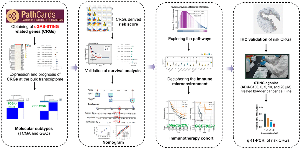 While previous articles have investigated the role of the cGAS-STING pathway in BLCA, there are several aspects that make our work novel and distinct: 1-Prognostic Risk Model: We have developed a prognostic risk model using four key genes (IRF3, IKBKB, POLR3G, and CTNNB1) associated with the cGAS-STING pathway. This risk model enables the prediction of OS in BLCA patients. To the best of our knowledge, no previous study has specifically utilized these genes in a prognostic risk model for BLCA. 2-Integration of Clinical Information: In addition to the gene-based risk model, we have established an integrated nomogram that combines risk scoring with clinical information. This approach enhances the clinical practicality of our findings by allowing for a more comprehensive assessment of patient prognosis. 3-Tumor Microenvironment Differentiation: Our study demonstrates that the risk score derived from the CRG model can differentiate tumor microenvironments among different risk groups. This finding provides valuable insights into the underlying mechanisms of BLCA progression and potential targets for personalized immunotherapy. 4-Validation and External Data: We have validated our risk model using an external validation set obtained from the GEO database. This step further strengthens the reliability and generalizability of our findings.