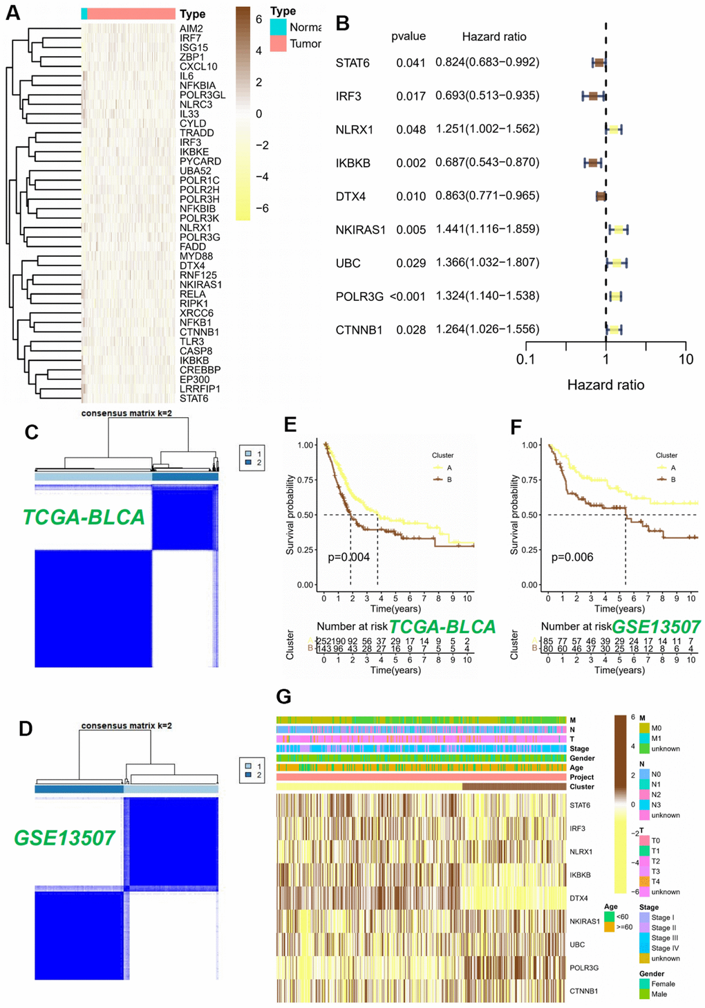 In summary, our study has successfully devised a robust prognostic model that demonstrates effectiveness in predicting both the prognosis and responsiveness to immunotherapy among patients with BLCA. Our study findings suggest that IRF3, IKBKB, POLR3G, and CTNNB1 hold promise as viable therapeutic targets for individuals diagnosed with BLCA.