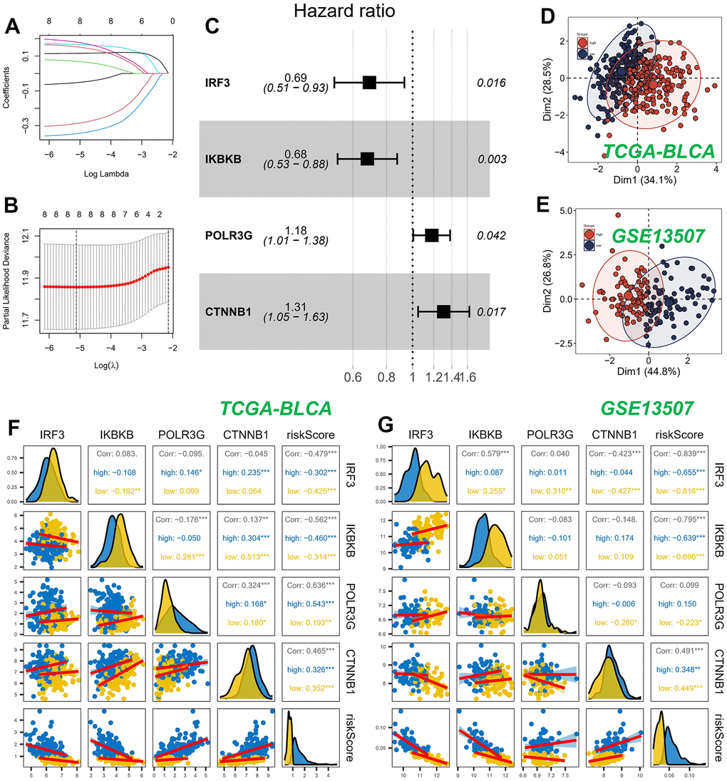 We constructed a prognostic model employing nine CRGs, identified through univariate Cox regression analysis on the TCGA training dataset, which exhibited statistically significant correlation with OS. The study employed LASSO Cox regression and multivariate Cox regression analysis to ascertain a definitive set of four genes (Figures 3A, 3B). The risk score was determined by taking into account the coefficients and expression patterns of four essential genes integrated within the model (Figure 3C). Risk score = (-0.3699 × IRF3 expression) + (-0.3873 × IKBKB expression) + (0.1642 × POLR3G expression) + (0.2673 × CTNNB1 expression). Principal component analysis (PCA) was utilized to effectively segregate the TCGA and GSE13507 datasets into two distinct groups based on the risk score (Figures 3D, 3E). The assessment of gene expression levels indicated a prevailing trend of positive correlations among the model genes. Notably, IRF3 and IKBKB exhibited the highest positive correlations with POLR3G and CTNNB1, respectively. Our observations revealed a strong association between the genes and the model risk score. Specifically, IRF3 and IKBKB displayed substantial negative correlations, whereas POLR3G and CTNNB1 exhibited significant positive correlations (Figures 3F, 3G).