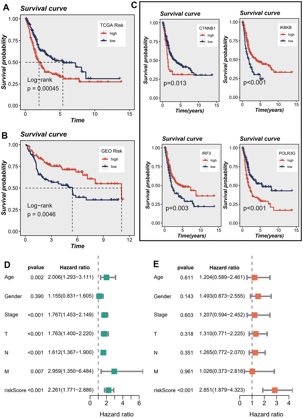 The patient population was stratified into high-risk and low-risk groups based on the median risk score, serving as criteria for classification. Survival analysis using the Kaplan-Meier method revealed that, within the TCGA cohort, patients classified as high-risk exhibited significantly inferior OS outcomes when compared to their low-risk counterparts (Figure 4A). In contrast, within the GEO cohort, patients classified as high-risk exhibited notably prolonged OS compared to those categorized as low-risk (Figure 4B). Figure 4C illustrated the influence of individual genes on survival. The findings suggested that the IRF3 and IKBKB genes exhibited a protective effect, implying that downregulating the expression of these genes could potentially improve patients’ OS. On the contrary, POLR3G and CTNNB1 were identified as genes associated with high risk, and their upregulated expression was linked to a decrease in patient survival.