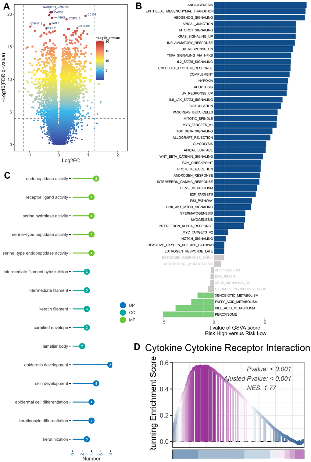 The DEGs were subjected to GO enrichment analysis (Figure 6C), which unveiled several key biological processes (BP) at play. The aforementioned processes predominantly involve the development of the epidermis and skin, the differentiation of epidermal cells and keratinocytes, as well as the process of keratinization. The cellular component (CC) analysis revealed a predominant representation of several key components, namely the intermediate filament cytoskeleton, intermediate filament structures, keratin filaments, and the cornified envelope. The primary classifications within molecular function (MF) comprised endopeptidase function, receptor ligand interaction, serine hydrolase role, serine-type peptidase function, and serine-type endopeptidase activity. GSEA was conducted on high- and low-risk BLCA groups (Figure 6D). The GSEA enrichment analysis revealed that the top-scoring NES corresponded to the cellular receptor interplay pathway involving cytokines. Specifically, the pathway involving cellular receptor interplay in high-risk BLCA patients was significantly activated (NES = 1.77, P < 0.001).