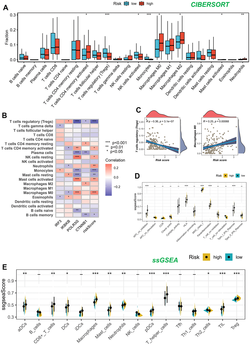 We utilized the CIBERSORT technique to analyze samples of BLCA, aiming to determine the composition of immune cells in both high-risk and low-risk groups, while investigating relationships between model genes, and risk score. As depicted in Figure 7A, the composition of regulatory T (Treg) cells, activated NK cells, and monocytes was comparatively diminished within the high-risk cohort (P < 0.05), whereas memory-activated CD4+T cells, M2 macrophages, M0 macrophages, activated mast cells, and neutrophils exhibited greater prominence in the high-risk population (P < 0.05). We also assessed the relationship between the five genes in the proposed model and the abundance of immune cells. We observed that most immune cells were significantly correlated with the five genes (Figure 7B). Figure 7C illustrated the inverse correlation between the risk score and the relative abundance of Treg cells, while displaying a positive correlation with M0 macrophages.