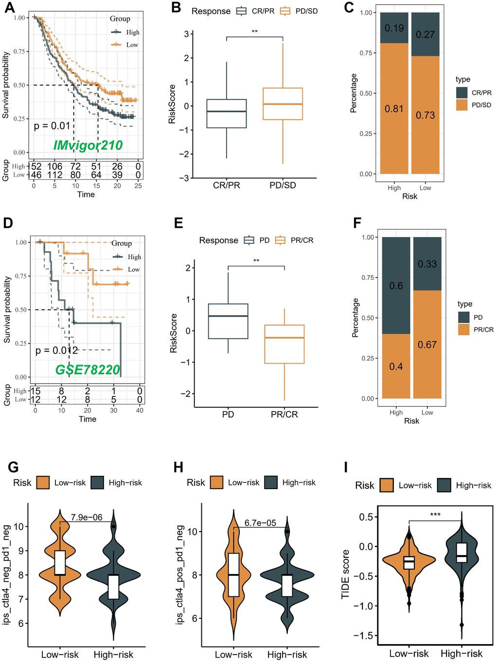 We conducted an evaluation of the association between the risk score and the response to immune therapy in the IMvigor210 cohort. This cohort comprised patients diagnosed with advanced urothelial carcinoma who underwent treatment with PD-L1 blockade. Patients classified as low-risk exhibited substantial survival advantages in contrast to individuals categorized as high-risk (Figure 8A). The risk score of patients belonging to the progressive disease (PD)/stable disease (SD) group demonstrated a noteworthy increase when compared to the partial response (PR)/complete response (CR) group (Figure 8B). It is noteworthy to highlight that the incidence of PR/CR within the high-risk group was considerably lower compared to the low-risk group. On the contrary, there was a contrasting pattern observed in the proportion of patients with PD/SD, indicating that the implementation of a risk score holds promise in elucidating the therapeutic efficacy of patients undergoing ICB therapy (Figure 8C).