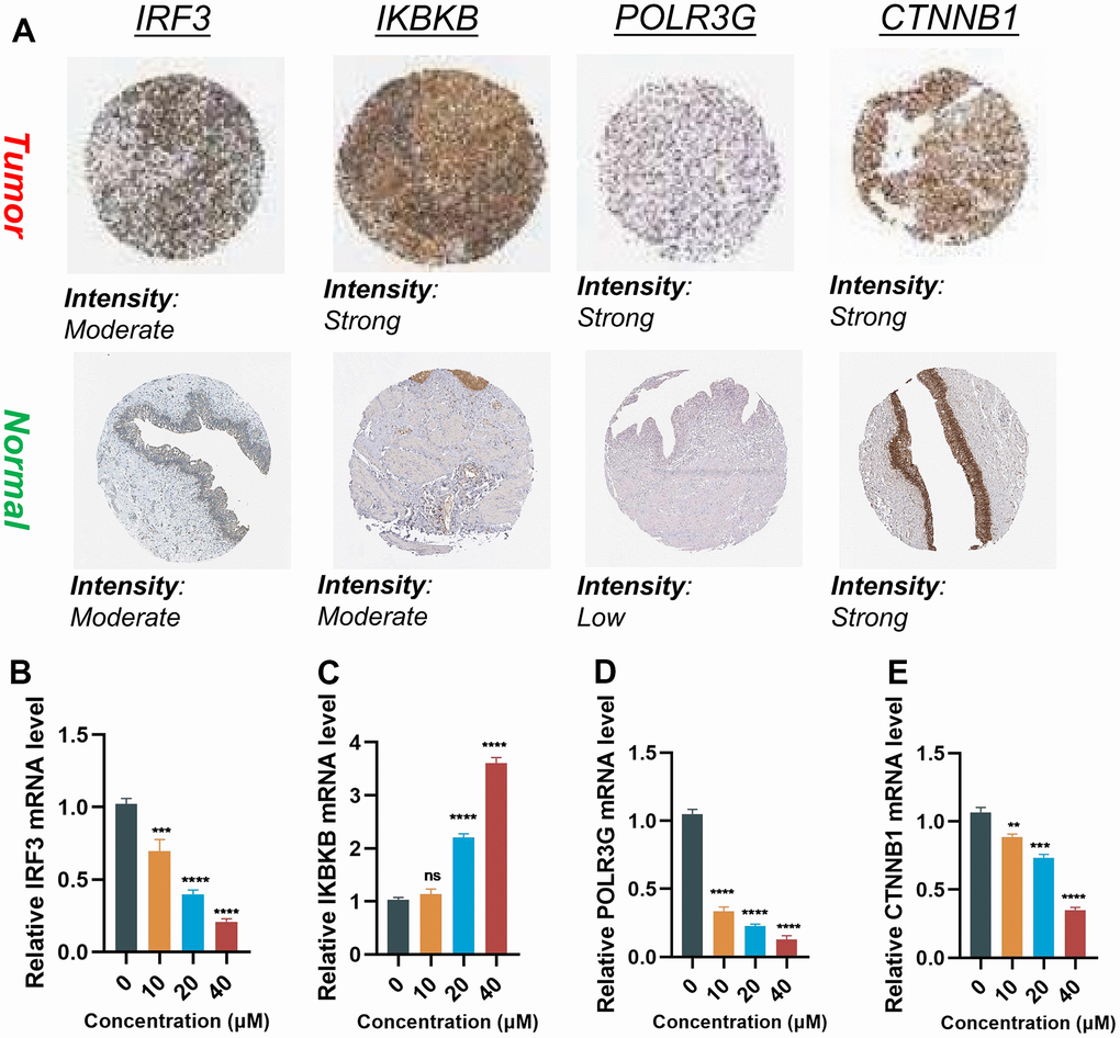 In order to elucidate whether the expression levels of four genes were influenced by the state of the cGAS-STING pathway, we employed varying concentrations of ADU-S100 (a cGAS-STING pathway agonist) to treat the T24 cell line of BLCA. The RT-qPCR results revealed that alterations in the cGAS-STING pathway status were accompanied by concentration-dependent modifications in the aforementioned quartet of genes. Upon activation of the cGAS-STING pathway, it was observed that the expression of IRF3 and IKBKB was increased (P < 0.05), whereas the expression of POLR3G and CTNNB1 was decreased (P < 0.05) (Figure 9B–9E).