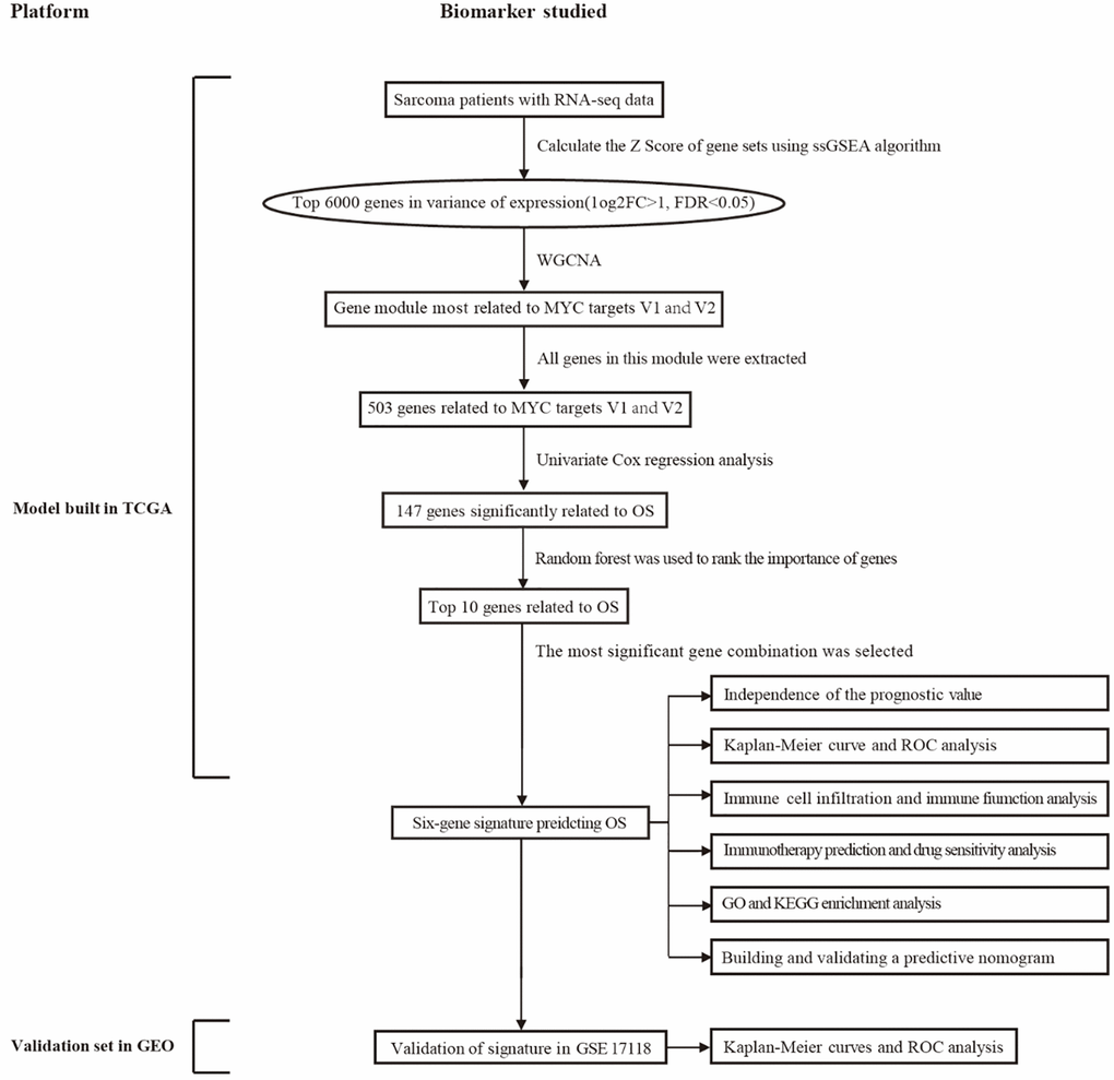 Figure 1 illustrates the entire study workflow. Detailed procedures for constructing survival prediction models for sarcoma patients are provided below. As a first step, cancer hallmarks were identified as major risk factors for survival in patients with sarcoma, including MYC targets V1 and V2. Then ssGSEA, weighted gene co-expression network analysis (WGCNA), and univariate Cox regression analysis were used to screen promising candidates. Using a random forest algorithm and combinatorial screening methods, a prognostic gene signature associated with MYC targets V1 and V2 was developed. The prognostic value of the risk score based on the gene signature was assessed in a training set (TCGA) and an independent validation set (GSE17918). Table 1 summarizes patient information from the TCGA and GEO cohorts.
