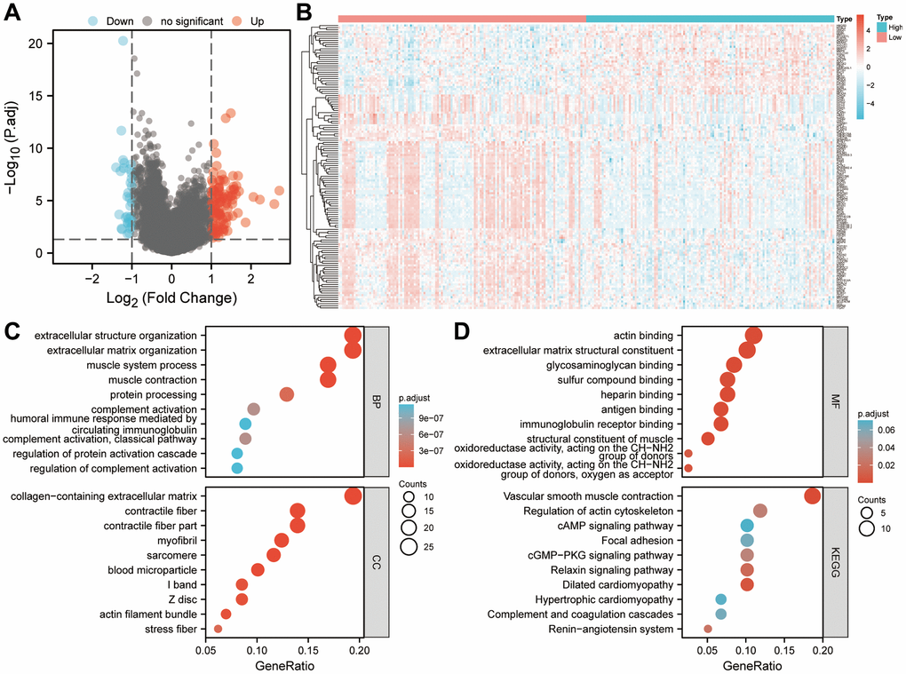 We used p < 0.05, |log2FC| >1 as a threshold to identify genes that are associated with high risk and low risk. These differentially expressed genes were then analyzed using GO and KEGG enrichment analysis.
