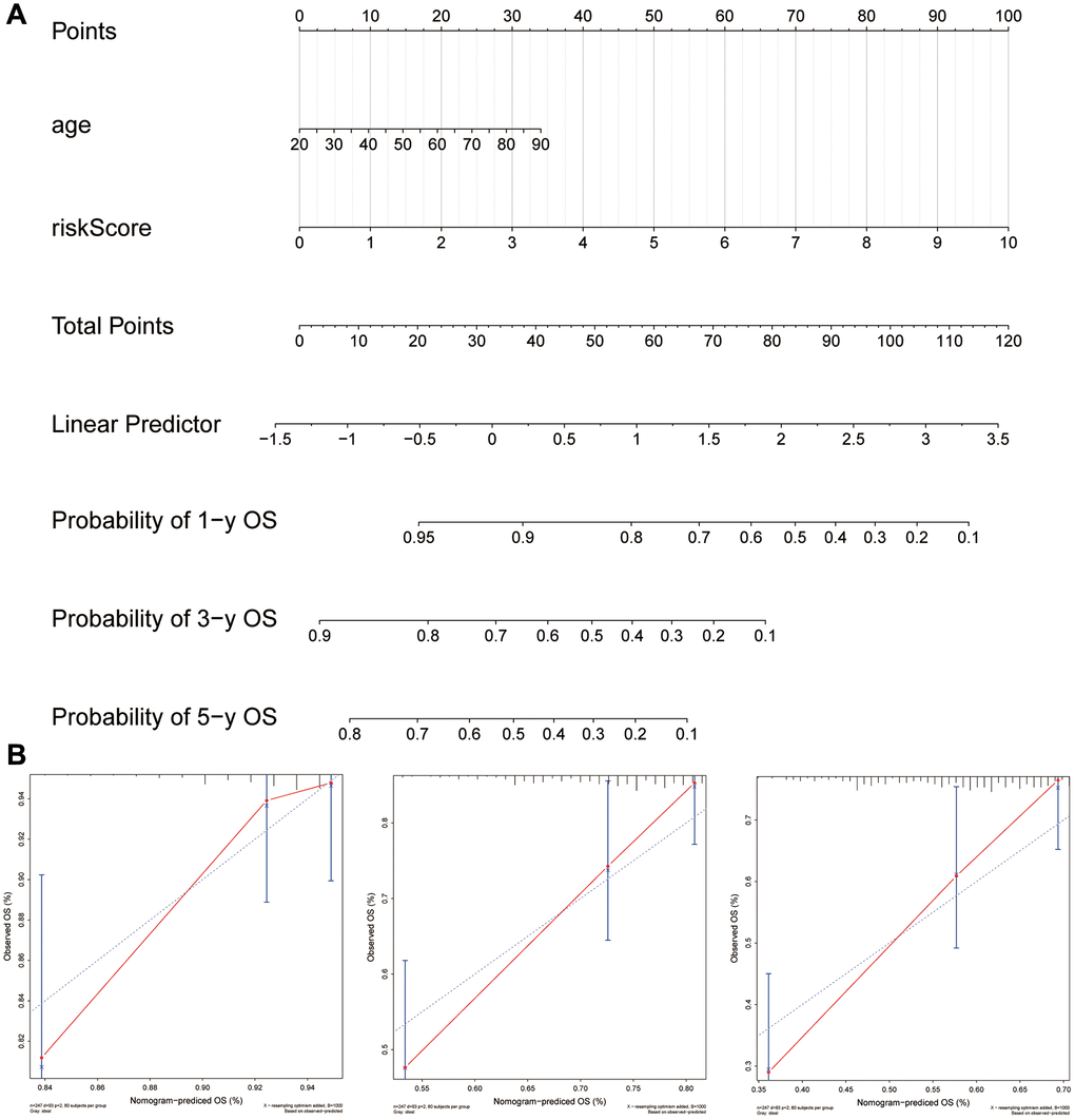 With the six-gene signature and patient age combined, a clinically useful nomogram was constructed (Figure 11A). By analyzing calibration curves (Figure 11B), the predictive power of this nomogram was verified. According to the results, the predicted 1-, 3-, 5- and 10-year survival probabilities were mostly in agreement with what actually occurred.