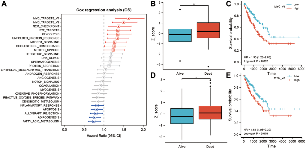 TCGA-SARC cohort overall survival data and ssGSEA scores were used to calculate and rank the Cox coefficients for cancer hallmarks. As a result of univariate analysis, MYC targets V1 and V2 had a greater impact on sarcoma patient survival than the G2M checkpoint, E2F targets, glycolysis, unfolded protein response, mtorc1 signaling, cholesterol homeostasis, mitotic spindle and other cancer hallmarks (Figure 2A). A higher Z-score was observed for MYC targets V1 and V2 for patients who died during the follow-up period, as shown in Figure 2B, 2D. The median Z-score was used as the cut off value to separate 256 TCGA-SARC sarcoma patients into high- and low-risk groups. In the high MYC targets V1 Z-score group, overall survival rates were lower than that in the low MYC targets V1 Z-score group (HR = 1.90, P = 0.002; Figure 2C). Similarly, in the high MYC targets V2 Z-score group, overall survival rates were lower than that in the low MYC targets V2 Z-score group (HR = 1.61, P = 0.019; Figure 2E).