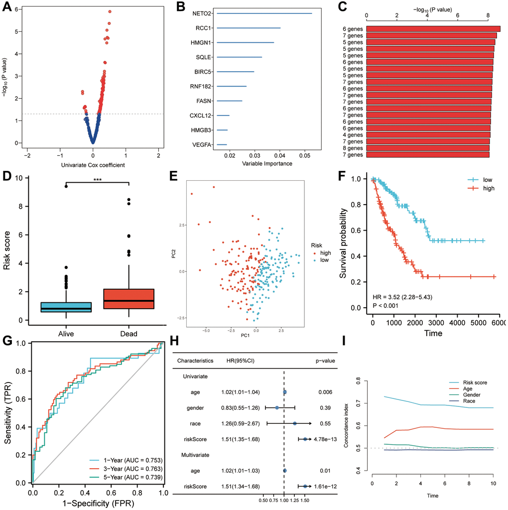 In a univariate Cox regression analysis, 147 genes from the brown module were found to be most significantly associated with prognosis in patients with sarcoma (Figure 4A). A random forest was used to rank the importance of candidate genes, and the 10 most significant genes were screened (Figure 4B). After selecting a gene combination with fewer genes and more significant p-values from multiple combinations of 10 genes, a survival risk model was constructed (Figure 4C). Finally, a prognostic model for sarcoma patients was constructed using six hub genes: risk score = 0.05 × VEGFA + 0.25 × HMGB3 + 0.22 × FASN + 0.40 × RCC1 + 0.46 × NETO2-0.10 × BIRC5. A significant difference was found between the risk scores of patients who died during follow-up and those who survived (Figure 4D). Risk score has been shown to be a useful tool for evaluating sarcoma patients’ prognoses based on principal component analysis (Figure 4E). The overall survival of the high-risk score group was lower (HR = 3.52, P < 0.001, Figure 4F). As shown by the ROC curve, the AUCs of the risk score were 0.753, 0.763, and 0.739 for predicting 1-year, 3-year, and 5-year survival, respectively (Figure 4G). So the risk score appeared to be a good predictor of survival in patients with sarcoma. Further, univariate and multivariate Cox regression analyses showed that age (HR = 1.02, p = 0.01) and risk score were independent predictors of overall survival (Figure 4H). According to a subsequent analysis of the C-index, the risk score predicted survival more accurately than clinical factors such as age, gender and race (Figure 4I).