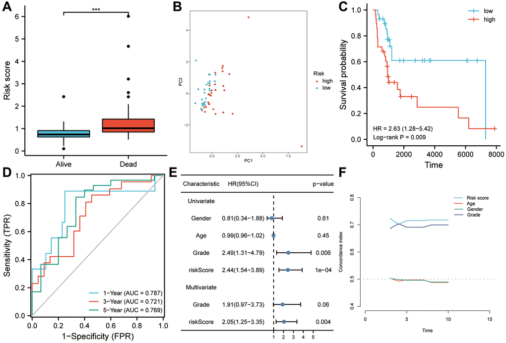 In order to validate the robustness of the prognostic six-gene signature associated with MYC targets V1 and V2, an independent external cohort (GSE17118) was utilized. A significant difference between patients who died during follow-up and those who survived is demonstrated in Figure 5A (P < 0.001). Figure 5B shows that the risk score may provide a new dimension for assessing sarcoma prognosis. Based on Kaplan-Meier analysis, patients with high-risk scores had a lower overall survival rate (P < 0.01; Figure 5C). In the ROC curve, the accuracy of the risk score for the prediction of 1-, 3-, and 5-year survival was 0.787, 0.721, and 0.769, respectively, showing that this model is effective in predicting survival (Figure 5D). Moreover, Cox regression analysis of univariate and multivariate data showed that risk score can be an independent predictor of overall survival (HR = 2.05, p = 0.004; Figure 5E). In the study of the C-index, the risk score was significantly better at predicting survival than any clinicopathological characteristic, such as age, gender and grade (Figure 5F).