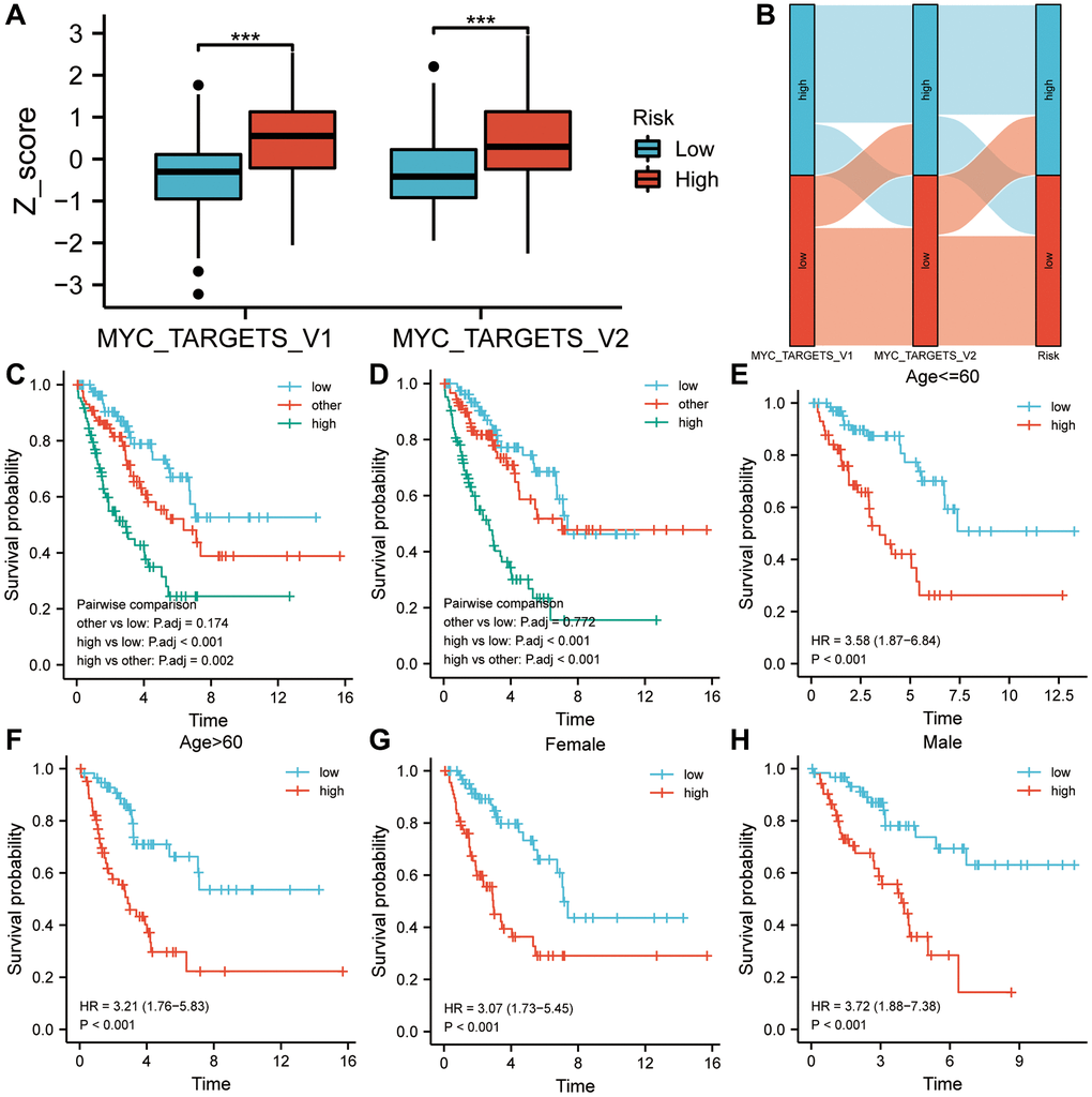 In Figure 6A, both MYC targets V1 and V2 Z-scores were higher in the high-risk group. High-risk groups had higher proportions of high Z-scores on MYC targets V1 and V2 than low-risk groups, as shown in Figure 6B. The results of the two-way survival analysis combined with cancer hallmarks indicated that sarcoma patients with high-risk-scores and high MYC targets Z-scores showed the lowest overall survival rates (Figure 6C, 6D). Figure 6E–6H illustrates how the six-gene signature can distinguish high-risk patients with poor prognoses based on clinical characteristics such as age and gender (P < 0.001).