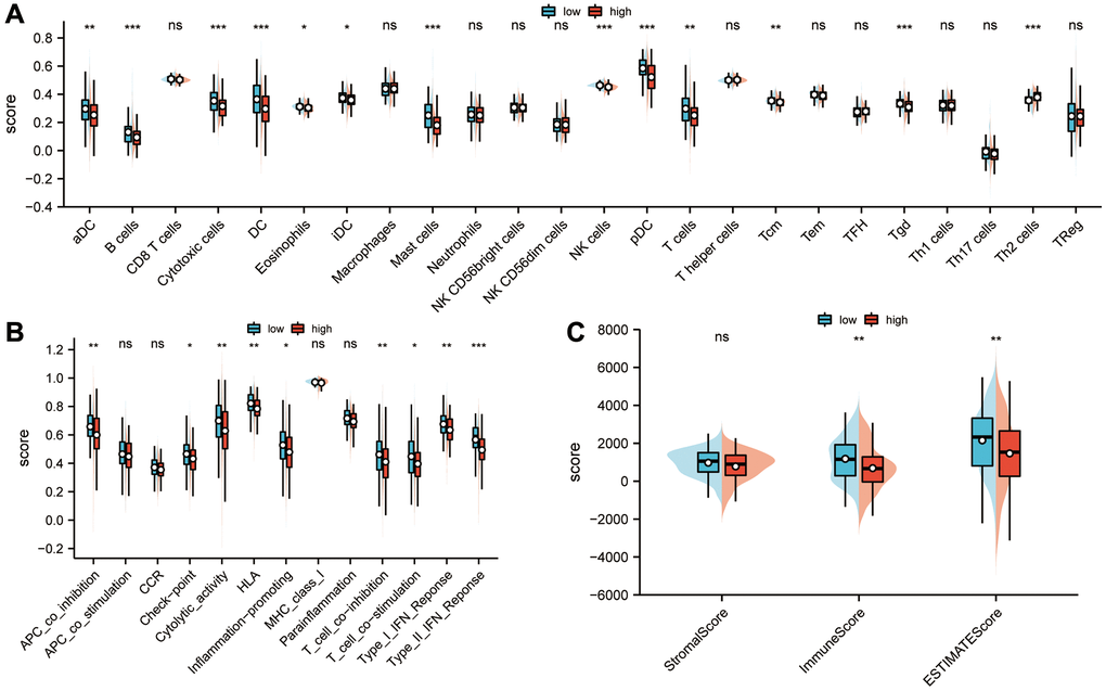 Considering TIME’s importance for tumor cell growth, we correlated the risk score with TIME. Firstly, the correlation between risk score and immune cell infiltration status was examined [23]. There are a number of immune cells that are involved in the analysis, including aDC, B cells, cytotoxic cells, DC, eosinophils, iDC, mast cells, NK cells, pDC, T cells, Tcm, Tgd, and Th2 cells. Also explored was the relationship between the risk score and immune function. In addition, immune scores for sarcomas were calculated using the ESTIMATE algorithm [24].