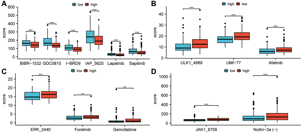 For the purpose of selecting effective drugs for sarcoma patients, drugs with different treatment predictions for high and low risk groups were explored. As shown in Figure 8A, BIBR-1532, GDCO810, I-BRD9, IAP5620, Lapatinib, and Sapitinib scored higher in the low-risk groups than in the high-risk groups (P < 0.001). Low-risk groups achieved significantly higher drug treatment scores with ULK 14989, UMI 77, and Afatinib (P < 0.001; Figure 8B). The treatment scores for ERK-2440, Foretinib, and Gemcitabine in the high-risk groups were higher than those in the low-risk groups (P < 0.01; Figure 8C). Additionally, a higher treatment score for JAK1-8709 and Nutlin-3a(-) was observed for high-risk groups (P < 0.001; Figure 8D).