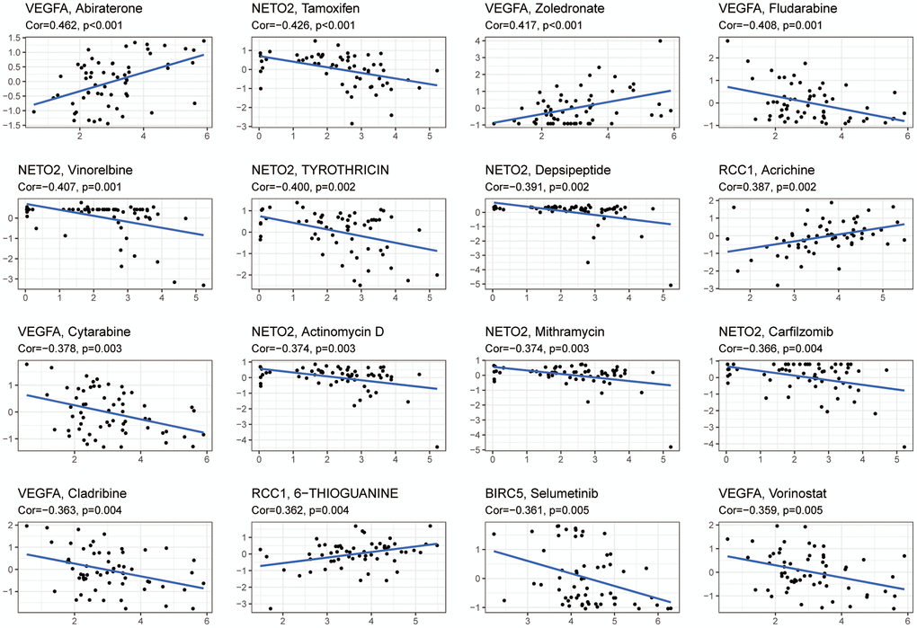 CellMiner™ database was used to analyze drug sensitivity for the six hub genes. Results showed a positive correlation between VEGFA expression and Abiraterone and Zoledronate drug susceptibility, as well as a negative correlation with Fludarabine, Cytarabine, Cladribine, and Vorinostat. There was a negative correlation between NETO2 expression and drug susceptibility to Tamoxifen, Vinorelbine, Tyrothricin, Depsipeptide, Actinomycin, Mithramycin and Carfilzomib. A positive correlation was observed between the expression of RCC1 and the drug sensitivity of acricine and 6-thioguanine. There was an inverse correlation between BIRC5 expression and Selumetinib susceptibility (Figure 9).