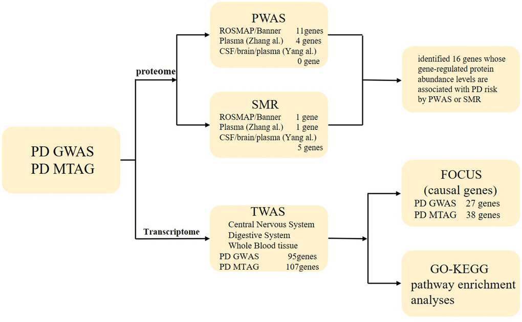 Genome-wide association analysis (GWAS) is the application of millions of single nucleotide polymorphisms (SNPs) across the genome as molecular genetic markers for conducting comparative or correlation analyses at the genome-wide level. GWAS involves comparing genetic variations to identify genes that influence complex traits [7, 8]. Nevertheless, these investigations are constrained to delineating the PD risk within a genomic region that includes multiple candidate genes. The specific genes responsible for the pathology at each region and the mechanisms through which they contribute to the risk of PD remain elusive. The majority of risk variants identified in GWASs are situated within noncoding regions, implying that these variants may impact disease susceptibility through the modulation of gene expression [9–12]. Recently, proteome-wide/transcriptome-wide association study (PWAS/TWAS), emerging as a new method, has been designed to explore the association between gene expression and disease across different tissues [13–17]. PWAS/TWAS are powerful approaches that integrate the gene expression reference panel (protein quantitative trait loci [pQTL] or expression quantitative trait loci [eQTL] cohort) and genome-wide associations from large scale GWAS to identify genes with cis-regulated expression associated with complex diseases [18–20]. Multi-trait analysis of GWAS (MTAG) can jointly analyze multiple traits, thereby enhancing statistical power for the detection of genetic associations related to each trait [21–23].