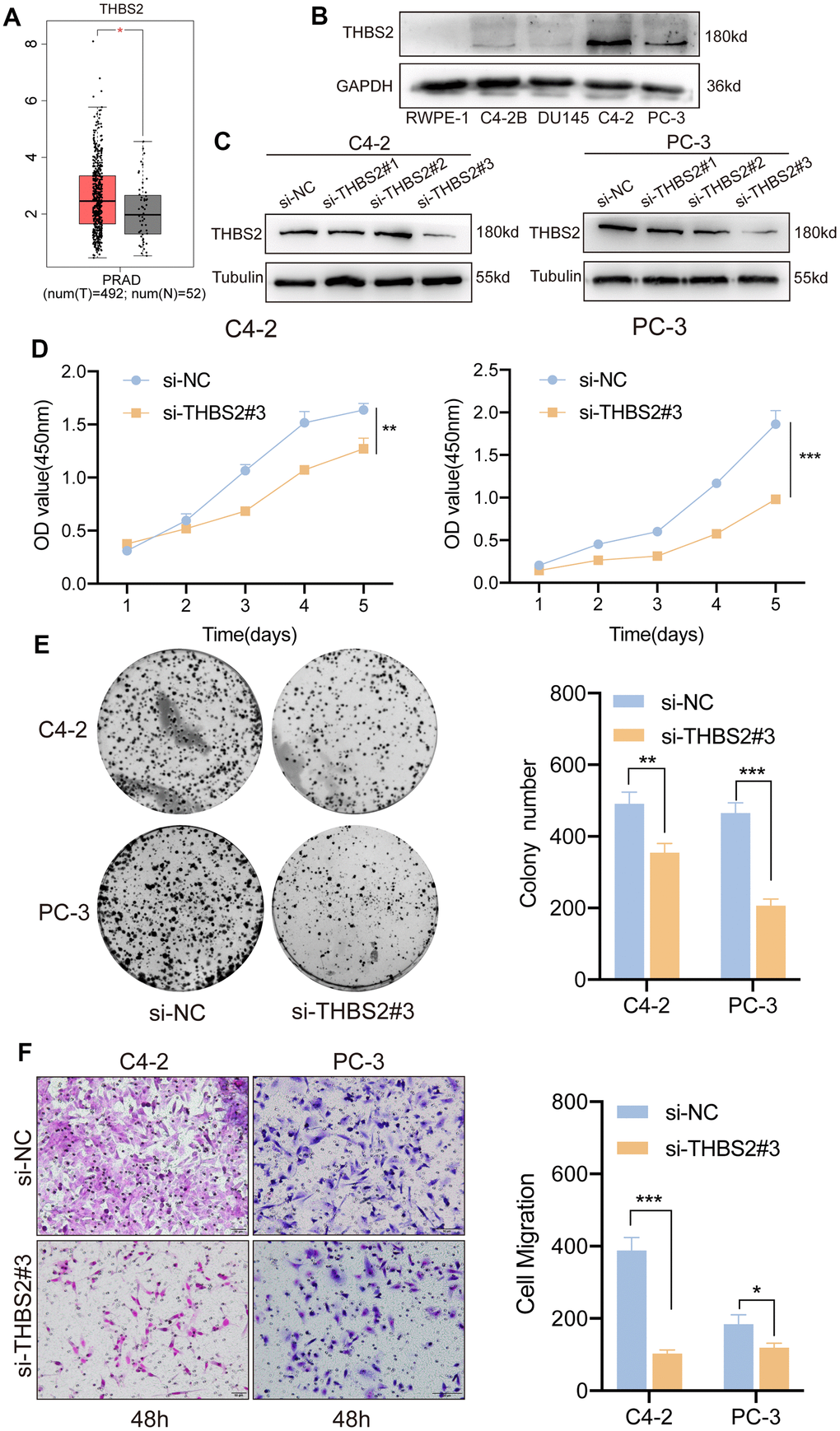Univariate and multifactorial Cox regression analyses confirmed that a high level of THBS2 expression was an independent adverse prognostic factor in PCa. However, its biological function in PCa remains unclear. TCGA database analysis revealed high THBS2 expression in PCa tissue compared to normal prostate tissue (Figure 10A). In addition, we also compared THBS2 expression levels between PCa cell lines (C4-2, C4-2B, DU145, and PC-3) and the normal prostate epithelial cell line (RWPE-1) by Western blotting analysis. The results showed that THBS2 was significantly upregulated in PCa cell lines, especially in C42 and PC-3 cells compared to RWPE-1 (Figure 10B), further demonstrating the upregulated expression of THBS2 in PCa. We used three siRNAs (si-THBS21#1, si-THBS2#2, and si-THBS2#3) to transiently knockdown THSB2 in two PCa cell lines C4-2 and PC-3. To evaluate the knockdown efficacy of THBS2, Western blotting showed that THBS2 expression was significantly reduced in C4-2 and PC-3 cells after transfection with si-THBS2#3 (Figure 10C). We chose si-THBS2#3 for the subsequent experiments due to it having the best efficiency of interference. Experiments have shown that the knockdown of THBS2 can inhibit the proliferation and colony forming abilities of C4-2 and PC-3 (Figure 10D, 10E). In addition, according to the migration results of Transwell, the silencing of THBS2 can significantly inhibit the migration of C4-2 and PC-3 (Figure 10F). Collectively, these results demonstrate that THBS2 promotes PCa cell growth and migration.