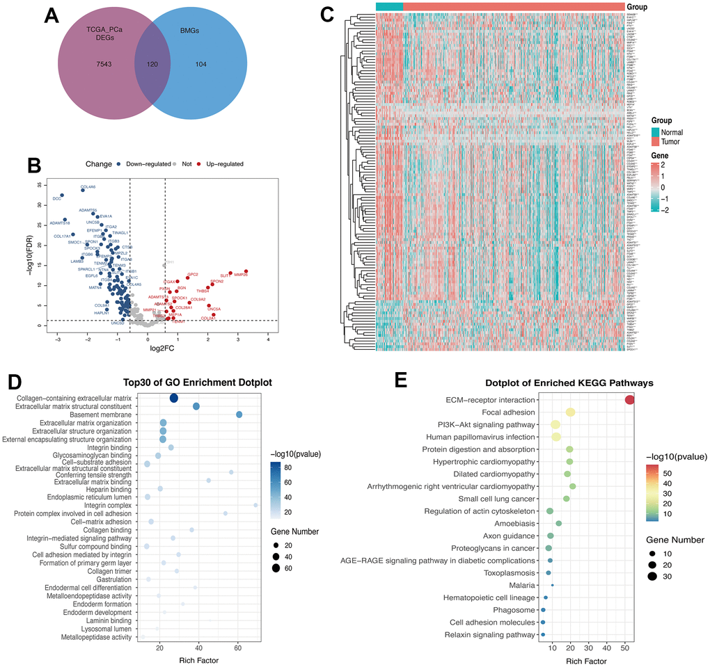 Differentially expressed genes (DEGs) were calculated in the TCGA-PRAD dataset using the “Limma” R package [18]. 120 differentially expressed BMGs (DE-BMGs) were included in the PCa based on a cut-off value of fold change > 1.5 and FDR < 0.05. The DE-BMGs are shown by a volcano plot and heat map. Subsequently, Gene Ontology (GO) and Kyoto Encyclopedia of Genes and Genomes (KEGG) enrichment analyses were performed using the “ClusterProfiler” R software package [19] to investigate the biological functions of the DE-BMGs.