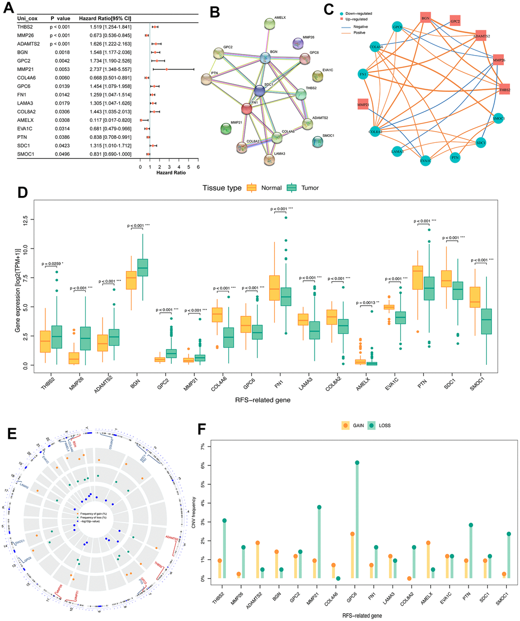 We performed univariate Cox regression survival analysis using the “survival” R package to extract DE-BMGs associated with RFS for further study. Subsequently, the mRNA expression of the above-mentioned genes was analyzed differentially in the TCGA-PRAD data. The PPI network of prognosis-related DE-BMGs was assessed using the Search Tool for the Retrieval of Interaction Genes (STRING, https://STRING-db.org). Amplifications and deletions of DE-BMGs were identified based on CNV data, and the CNV landscape was visualized using the R software package “OmicCircos” [20].