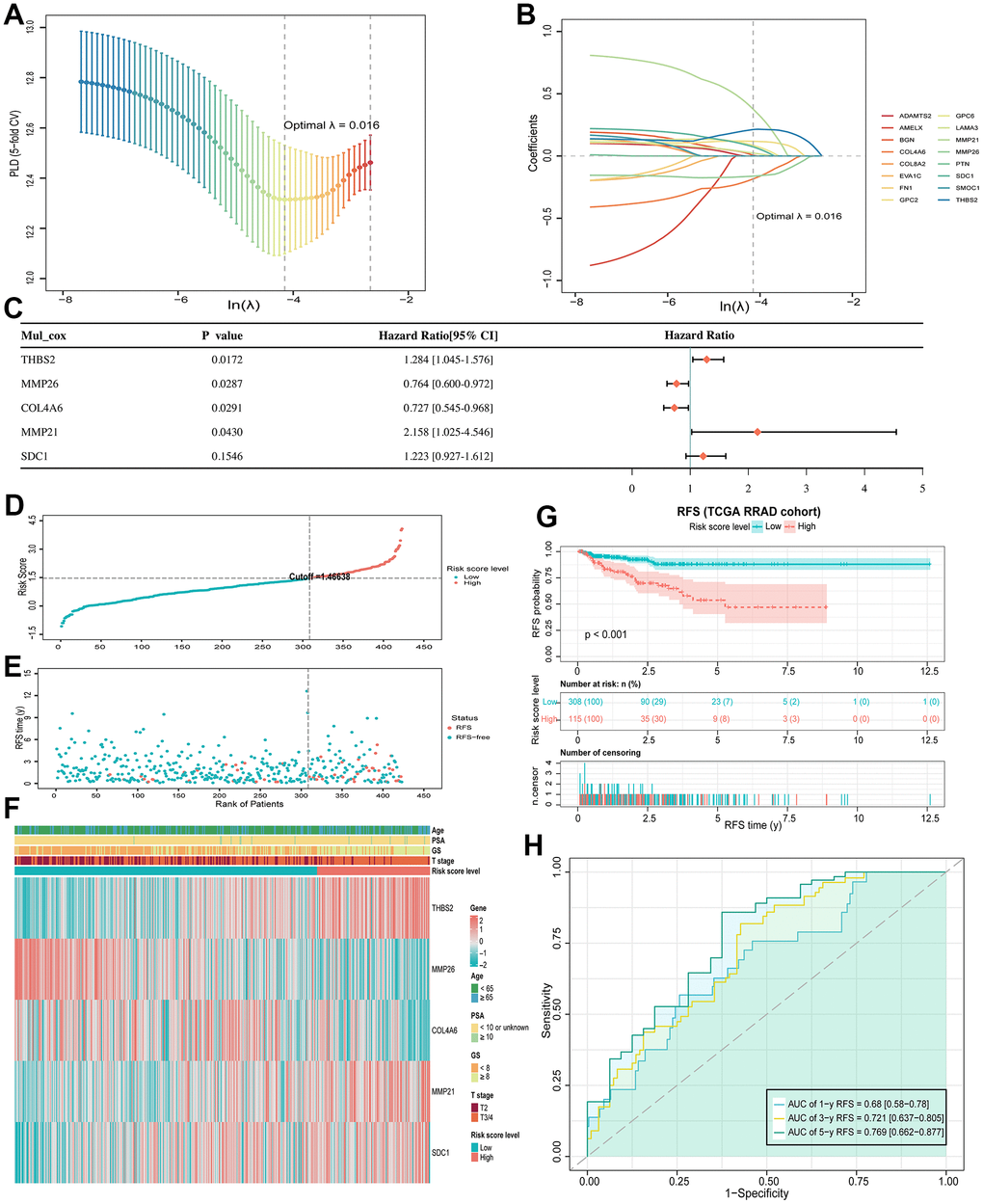 We downloaded transcriptome sequencing data and clinical information about PCa patients from the TCGA database as a training set. The five BMGs (THSB2, COL4A6, MMP21, MMP26 and SDC1) were identified as independent prognostic factors for RFS in PCa patients using stepwise multiple regression analysis. Previous studies have shown that BMGs are associated with PCa pathophysiology. He et al. found that THBS2 is a metastasis-specific biomarker and poor survival key regulator in human colon cancer [35]. Downregulation of collagen COL4A6 is associated with PCa progression and metastasis [36]. Recent studies have shown that soluble syndecan-1 (SDC1) serum level is an independent pre-operative predictor of cancer-specific survival in PCa, and SDC1 is associated with more aggressive tumors and a worse prognosis [37]. In addition, matrix metalloproteinases (MMPs) are a class of zinc-dependent endoproteases responsible for tissue remodeling and degradation of ECM proteins [38]. There are at least 23 matrix metalloproteinases expressed in humans, and MMP21 and MMP26 have been reported to play an important role in the progression of several cancers, including PCa [39, 40].