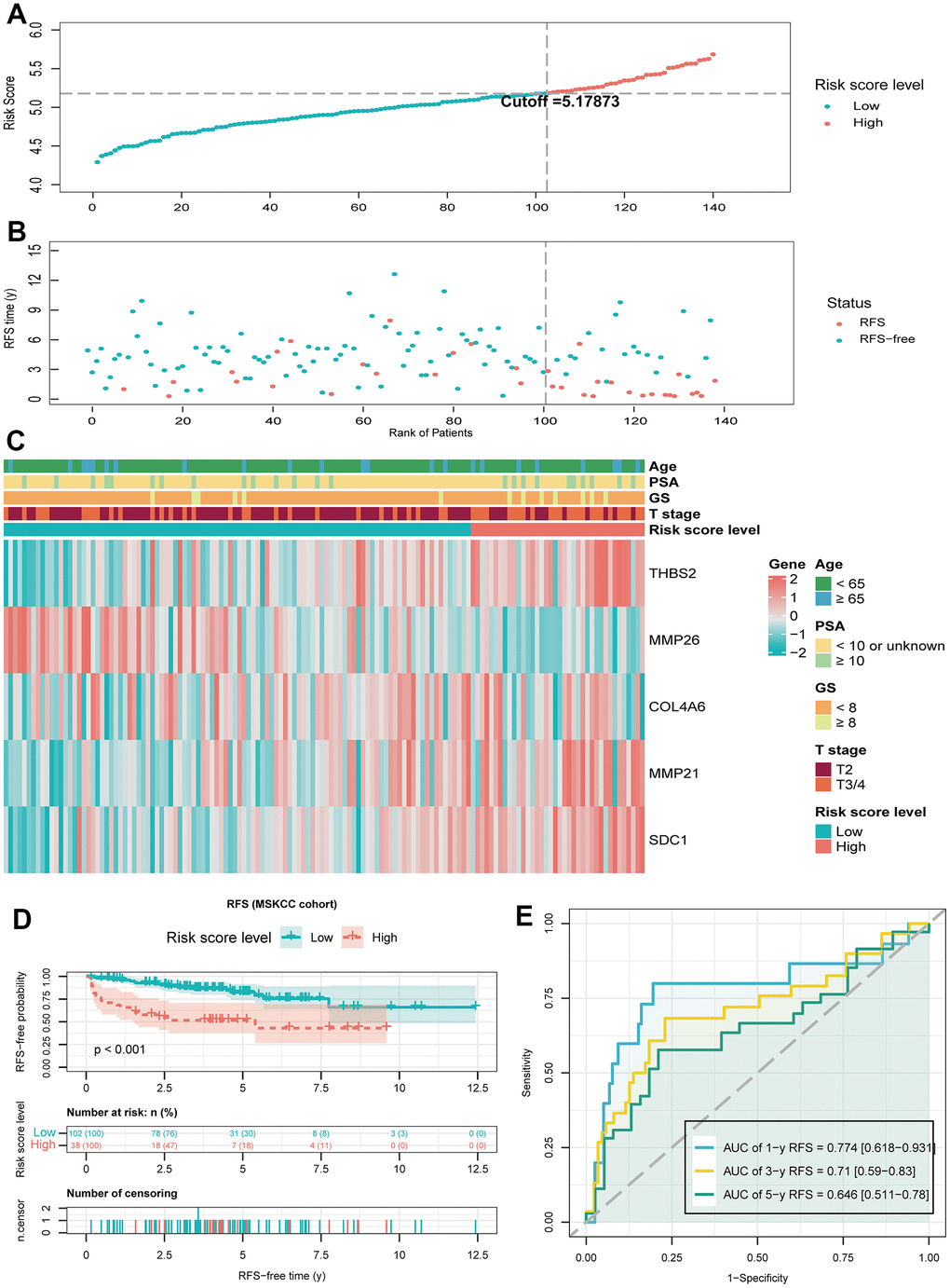 To further validate the prognostic value of BMRM, we filtered the MSKCC cohort containing RFS information in PCa and used it as an external validation set. Similarly, we used the same analysis in the validation set for the MSKCC cohort as in the TCGA training set, dividing 140 PCa patients into a low-risk group (n = 102) and a high-risk group (n = 38) based on a cutoff value of 5.17873. The distribution of BMRS, patient survival status, and gene expression profiles for the MSKCC cohort are shown in Figure 5A–5C, all of which follow the same trend as the TCGA training set. Kaplan-Meier analysis for the MSKCC cohort also showed a shorter RFS time for the high-risk group, suggesting a worse prognosis (Figure 5D). Similarly, ROC curves were used to assess the prognostic value of BMRM in the MSKCC cohort. Figure 5E demonstrated the AUC values of 0.774, 0.71, and 0.646 for 1, 3, and 5-year RFS in PCa patients, respectively. In summary, we confirmed the significant value of BMRM in predicting the prognosis of PCa patients with the TCGA training set and MSKCC validation set, where five carefully selected DE-BMG genes (THBS2, MMP26, COL4A6, MMP21, and SDC1) may be key molecules in PCa development.
