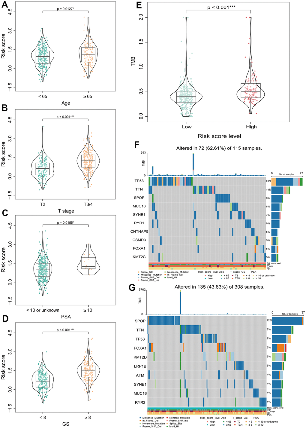 Next, we explored the relationship between BMRS and the clinicopathological characteristics of patients with PCa at different stages. The results showed that BMRS in PCa patients was significantly different from age (p = 0.0127), T-stage (p < 0.001), PSA (p = 0.0155) and Gleason score (p < 0.001) (Figure 6A–6D). Patients in the high-risk group had significantly increased Gleason score, T-stage and PSA levels. In addition, it was shown that patients with high TMB were more likely to benefit from immune checkpoint inhibitors (ICIs) therapy [28], and we further explored the differences in TMB between the high- and low-risk groups. Surprisingly, the TMB was significantly higher in the high-risk group than in the low-risk group (Figure 6E). In addition, comparing the mutation profiles, the proportion of mutations (like TP53 and TTN) was significantly higher in the high-risk group than in the low-risk group (Figure 6F, 6G).