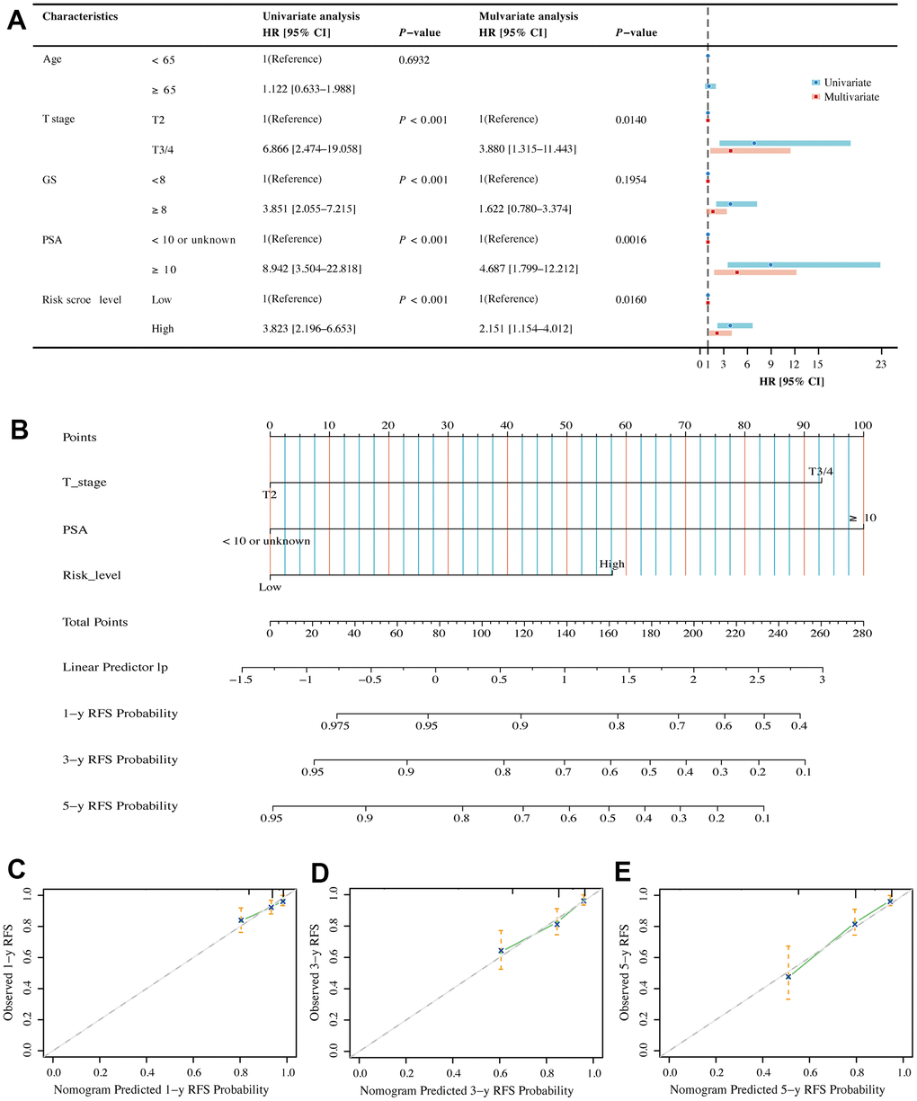 Univariate and multivariate Cox regression analyses were performed in the TCGA dataset to compare the correlation between clinical information (including age, T stage, PSA and Gleason score) and BMRS in PCa patients. Forest plots indicated that BMRS may act as an independent factor for RFS in PCa (Figure 7A). Moreover, the same results were observed in the forest plots of the MSKCC external validation set (Supplementary Figure 1). We then integrated clinical information from the TCGA dataset to generate a nomogram including BMRS to predict RFS at 1, 3, and 5 years for PCa patients (Figure 7B). As expected, the calibration curves for the nomogram showed a high degree of agreement between the predicted and the actual RFS values of the patients (Figure 7C–7E). These results suggest that BMRM based on five key genes can effectively predict RFS in PCa patients.