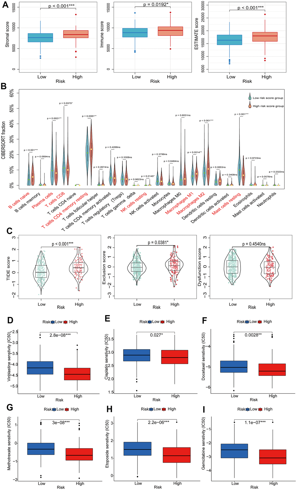The TIME is a highly heterogeneous ecosystem that typically contains a collection of tumor cell populations, immune cells, and tissue-specific resident and recruited stromal cell types. The study of TIME has provided theoretical support for the development of tumor immunotherapy [29]. Firstly, we explored the relationship between BMRS and TIME. The stromal score, immune score, and ESTIMATE score were all higher in the high-risk group than in the low-risk group (Figure 8A). Next, we compared the relative proportions of 22 immune cell types in samples from the two risk groups in the TCGA training set using CIBERSORT. Compared to the low-risk group, the high-risk group had a higher proportion of most tumor immune cells (Figure 8B), including initial B cells (p < 0.001), dormant CD4 memory cells (p = 0.0081), dormant natural killer cells (p = 0.145), M1-type macrophages (p = 0.0014), and M2-type macrophages (p < 0.001). ICIs are profoundly changing the therapeutic outlook for many cancers. Therefore, we screened for some classical ICIs and analyzed the correlation between BMRS and ICIs in PCa patients. The scatter plot results showed statistically significant expression of most immune checkpoint genes in both risk groups (Supplementary Figure 2). Interestingly, there was a significant positive correlation between BMRS and these seven immune checkpoints (BTLA, CD27, CTLA4, GPR65, HAVCR2, TIGIT and VSIG4; p < 0.001) and a significant negative correlation with CD38 (p < 0.001). In addition, we assessed the possible immunotherapy benefit between high- and low-risk individuals by TIDE score. It was shown that low-risk patients had significantly lower TIDE scores and immune escape capacity compared to high-risk patients, indicating a greater likelihood of benefiting from immunotherapy (Figure 8C). Finally, we also investigated the therapeutic response of PCa patients in both risk groups to chemotherapeutic agents. The results showed that patients in the high-risk group had a lower IC50, implying higher treatment sensitivity and response rates to Vinblastine, Cisplatin, Methotrexate, Docetaxel, Etoposide and Gemcitabine (Figure 8D–8I).