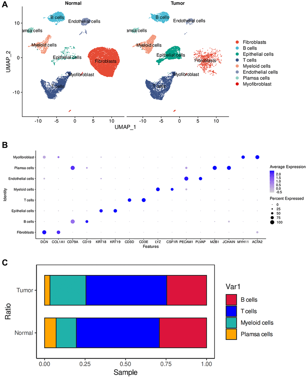 Firstly, the scRNA-seq analysis identified distinct clusters of cells within the tumor microenvironment, including non-immune cells such as fibroblasts, myofibroblasts, endothelial cells, and epithelial cells, as well as immunocytes such as myeloid-derived cells, T cells, B cells, and plasma cells. The observation of substantial heterogeneity in the composition of cell types in normal and tumor tissues suggests the importance of non-immune cells in tumor growth and development. Moreover, the infiltration of immune cells revealed an increase in myeloid cells and a decrease in plasma cells within tumor tissues, indicating potential immune cell dysregulation in the tumor microenvironment.