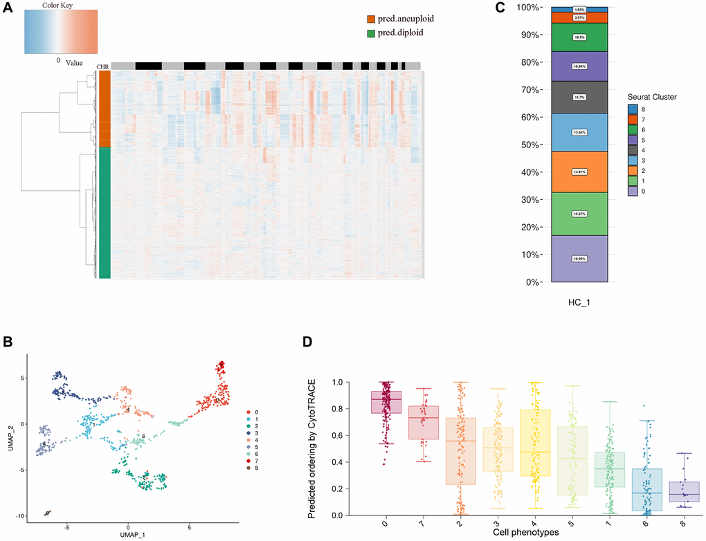 We performed dimensionality reduction clustering of esophageal tumor epithelial cells using unsupervised clustering and visualized nine distinct clusters with the unified manifold approximation and projection (UMAP) method. We found that the distribution of tumor cells across UMAPs is continuous, suggesting that these subpopulations may have continuity across the developmental lineage of tumor cells (Figure 2B). Through the distribution ratio of each subgroup, we found that cluster 0 has the most proportional distribution, which suggests that cluster 0 may have an important position in esophageal tumor cells (Figure 2C). Then, we predicted the relative differentiation state of cells by cytoTRACE for each subcluster, cluster 0 had the highest differentiation prediction score, and the results indicated that cluster 0 might be the starting point of all cells in the cell developmental trajectory (Figure 2D).